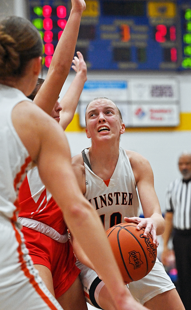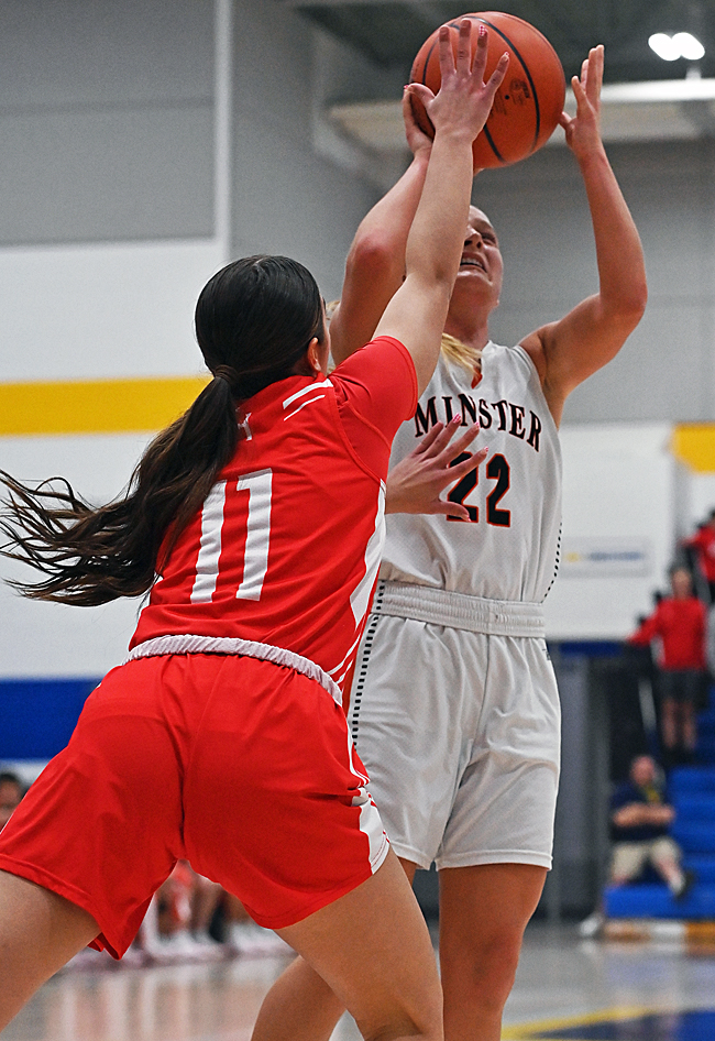 Minster’s Jenna Belcher fouled Addy Homan shooting a 3 — there was no ignoring this one because she was knocked for the floor with a thud — and Homan made all three free throws.