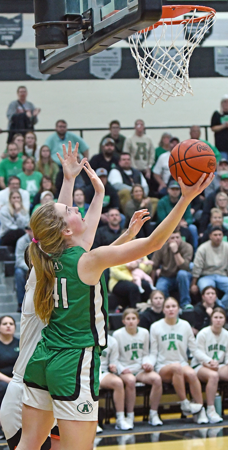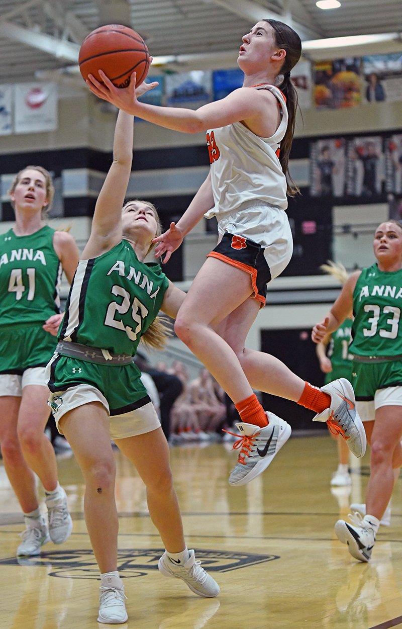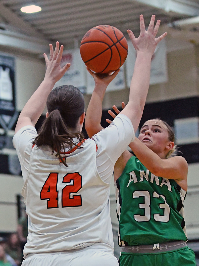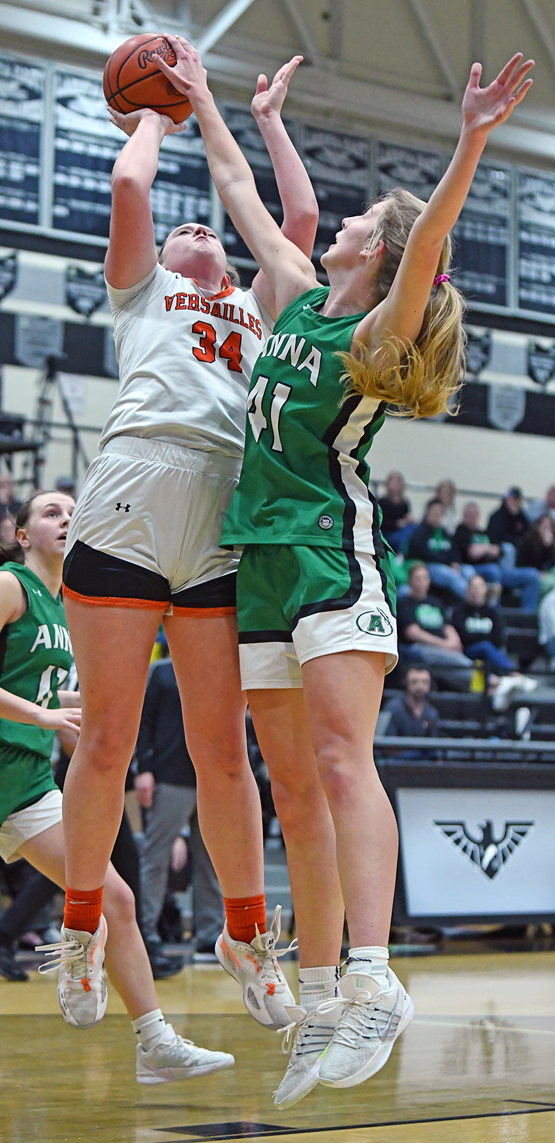 Anna’s 6-foot-3 Adyson Bales scored 12 of her 14 points in the second half and made the clinching free throws to finally subdue Versailles. (Press Pros Feature Photos by Jeff Gilbert)