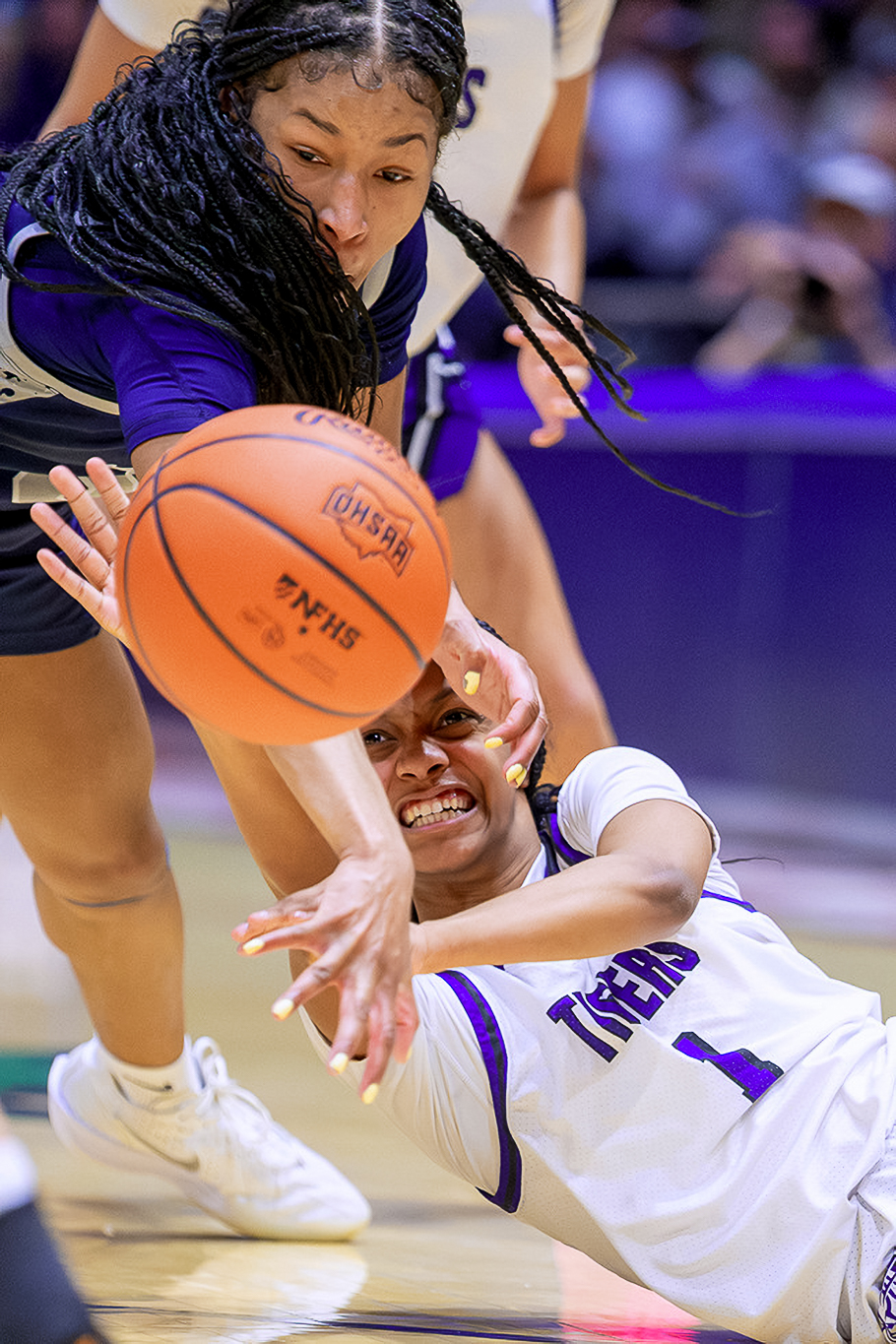 Gabby Plair tries to clear the ball after a scuffle, but the Tigers didn’t have quite enough, falling 45-41 to Kettering Fairmont in Dayton. (Press Pros Feature Photos by Logan Howard)