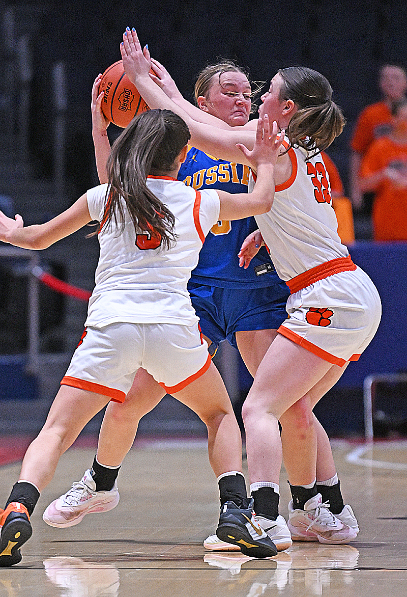Aryanna Cordonnier gets caught in a Tigers’ trap during the first half of Saturday’s Division VII Final.