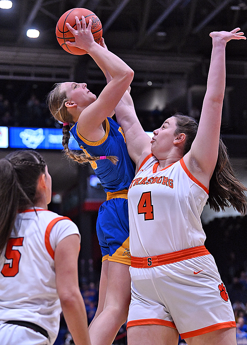 Faith York struggles for room to operate against Strasburg in the Division VII championship Final.