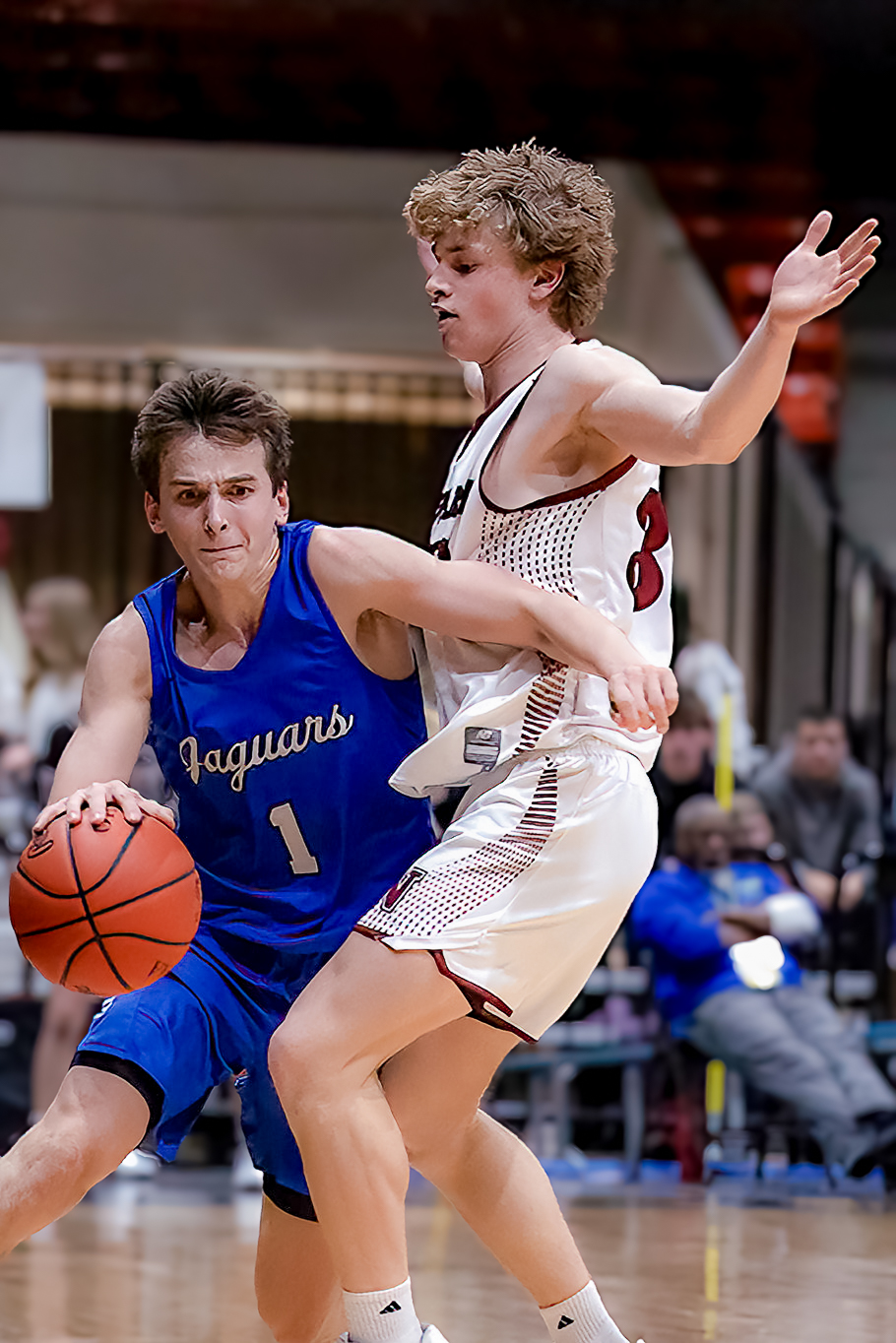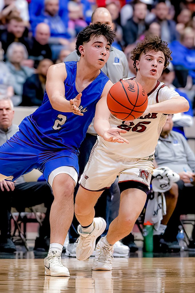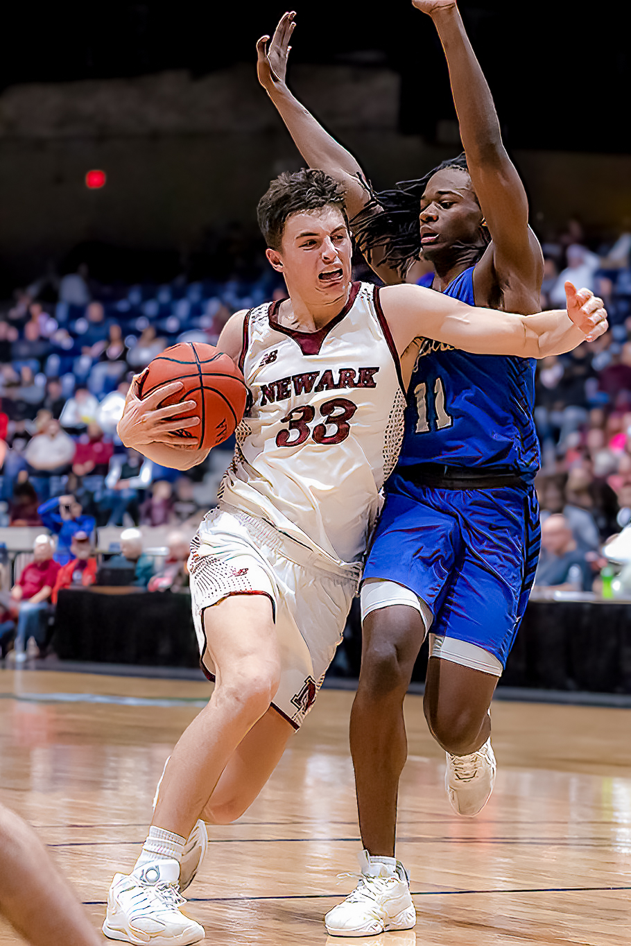Jake Quackenbush of Newark is closely guarded by Jayden Reed-Davis during the Division I regional final.
