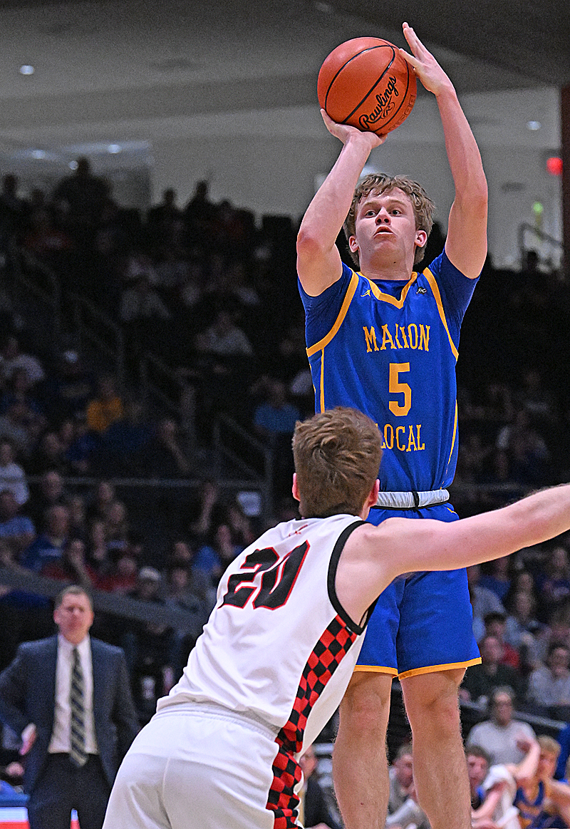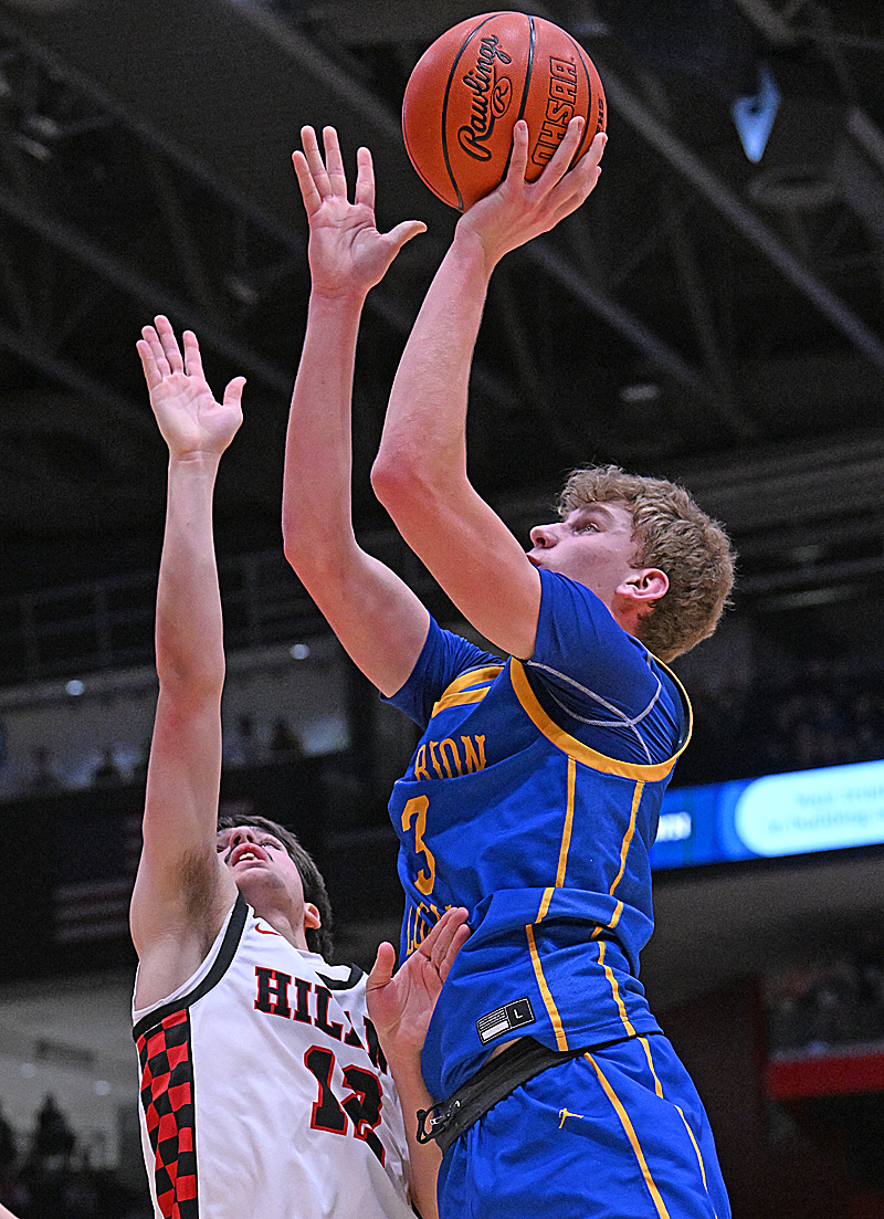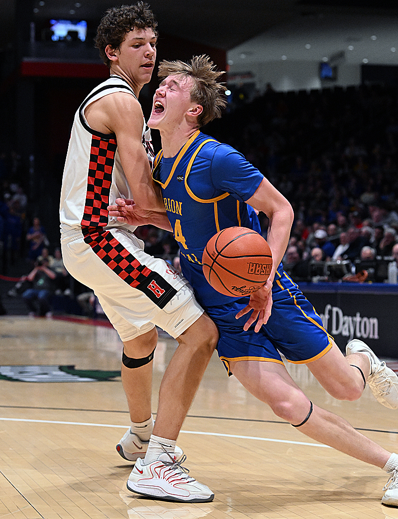 Marion Local’s Brennen Hess rises to score over Hiland’s CJ Yoder in the first half of Saturday’s Division VI championship game.