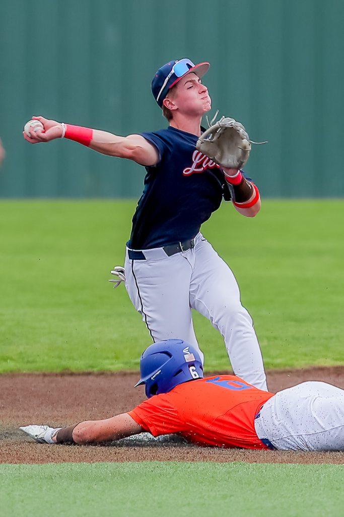 Orange got on the board in the top of the first when a Van Engelenhoven strikeout pitch eluded catcher Knox Brenning and Griffin Zavislak scored from third. The Liberty battery mates saved a second run when Van Engelenhoven deftly fielded a squeeze bunt with his bare hand and flipped it to Brenning for an out.