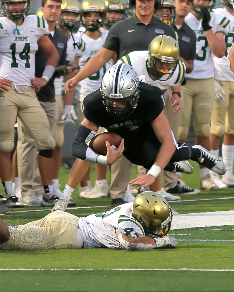 Jerome’s Michael Ezirim tries to dislodge the ball from the hands of Bradley receiver E.J. Teah Jr., but Teah held on.