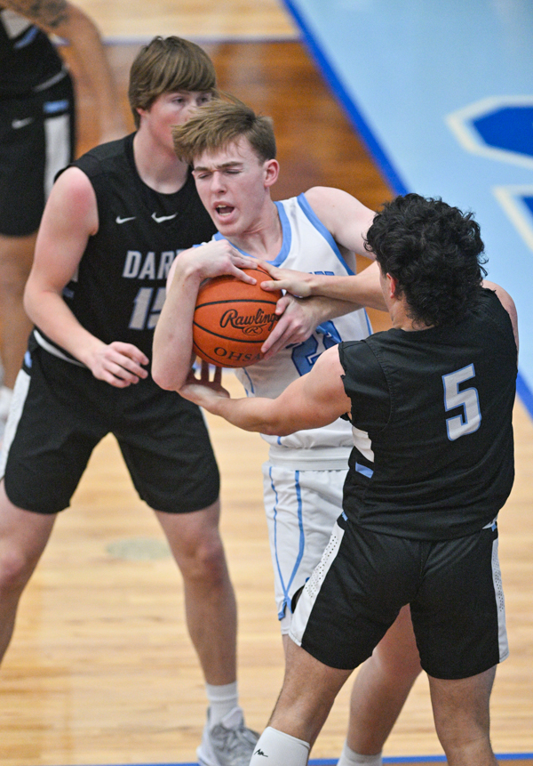 Olentangy Berlin’s Noah Gamble drives to the basket against a horde of Hilliard Darby defenders (PressPros Feature Photos by John Hulkenberg).