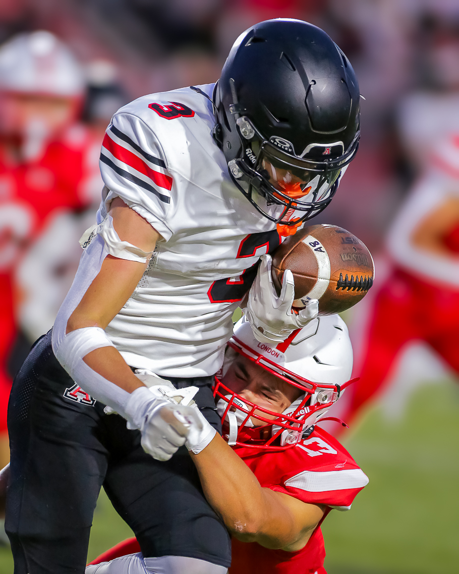Eric Neal gets a big hit on Trey Bentley, causing a turnover that led to London’s fourth touchdown in the first half. (Press Pros Feature Photos by Logan Gapen)