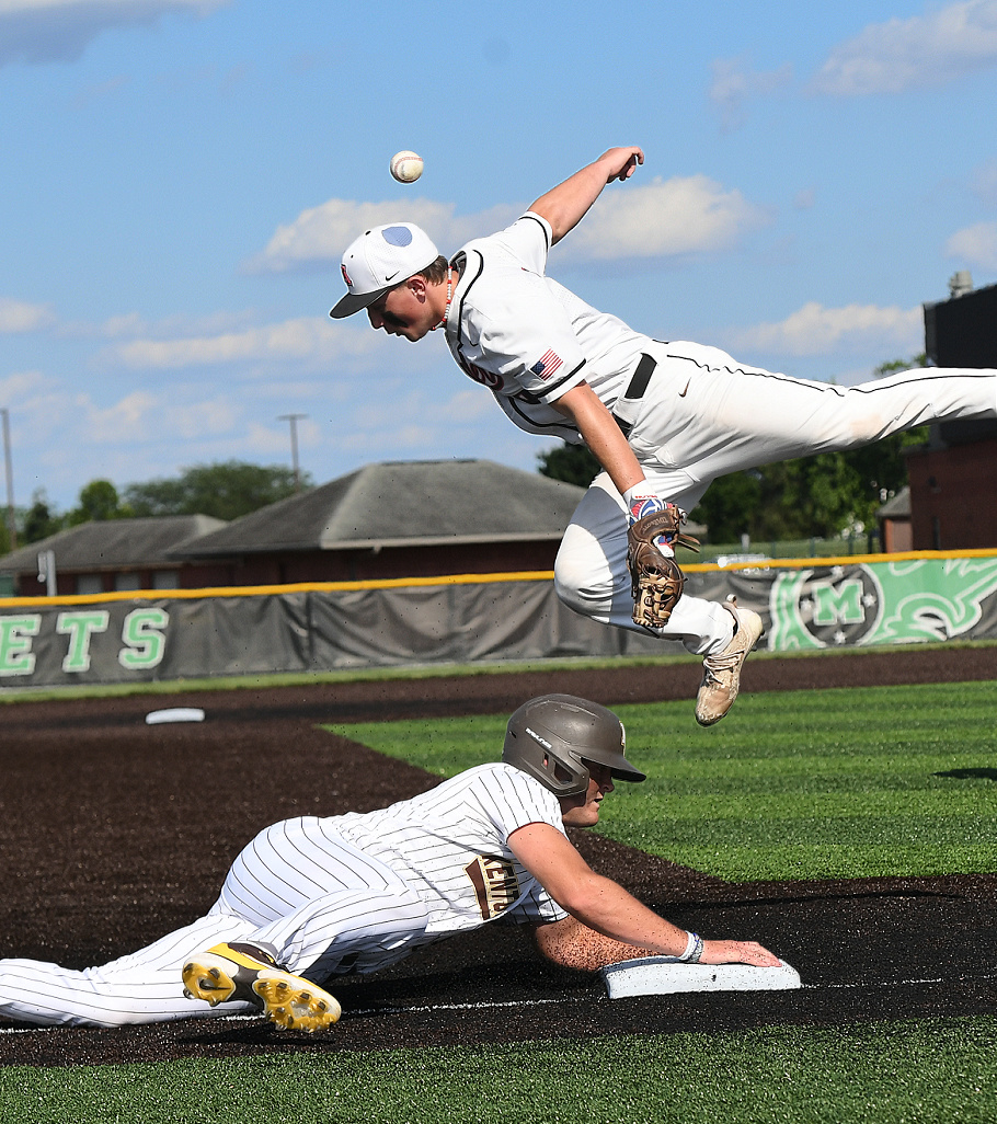It was sloppy at times and stress-inducing at others -- like when this infield throw on a bunt eluded Jonathan Alder's Cam Potter and allowed Kenton Ridge's Braden Smith to score -- but the Pioneers found a way to shed a pesky rival and defend their No. 1 state ranking in Division II while reaching the regional finals. (PressProsMagazine Feature Photos by Sheri Hooley).