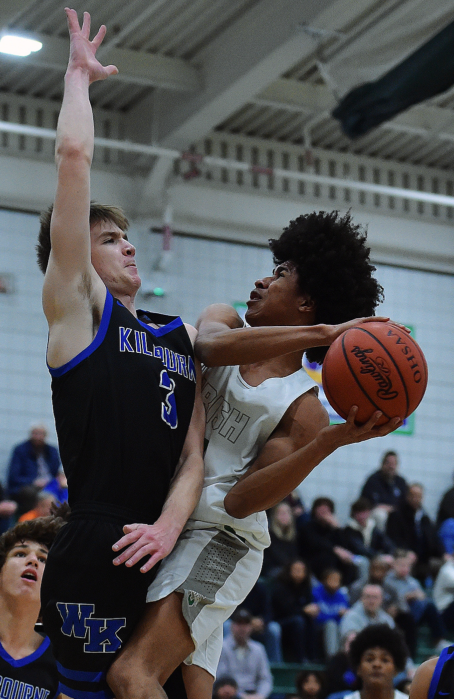 Points at the rim were heavily contested in the Battle of Hard Road, like this challenge from Kilbourne's Zack Wolford of Scioto's Aaron Foster, with the struggle requiring overtime before the Irish prevailed. Jarrod Ulrey has the story from Dublin...(PressPros Feature Photo by Sheri Hooley).