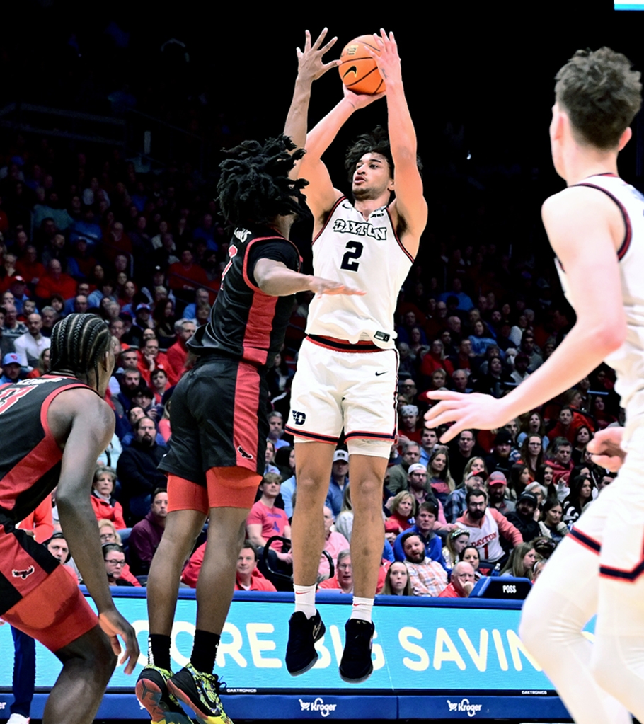The University of Dayton Flyers built a 30-11 first-half lead against Saint Joseph's and it looked like an easy runaway victory, but Saint Joseph's chipped away in the second half and drew within three points in the final minutes before Malachi Smith's two free throws sealed a 77-72 UD victory. Nate Santos launches one of the four straight three-pointers he buried. (pictured)