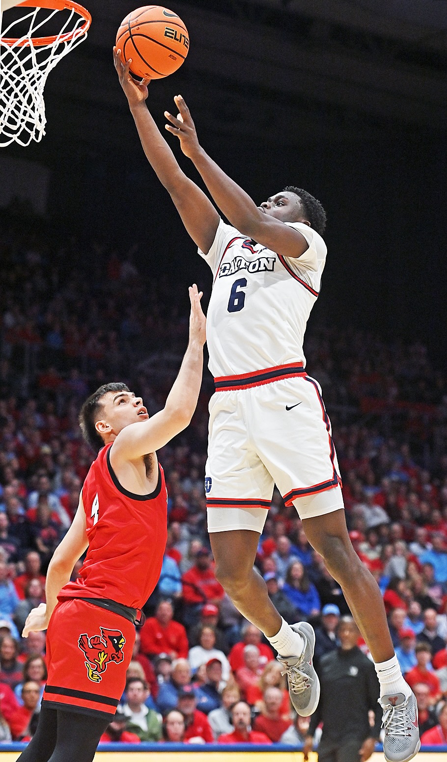It took Ball State 12 minutes to score its first basket and the University of Dayton Flyers constructed a 20-point lead in the first half, but the Cardinals adjusted at halftime and crept to within five points midway through the second half before Enoch Cheeks, Malachi Smith and Isaac Jack took over and led UD to its third straight victory, 76-69. The 6-3 senior transfer from Robert Morris, set a UD career high with 23 points and made it a double-double with 12 rebounds. (pictured)