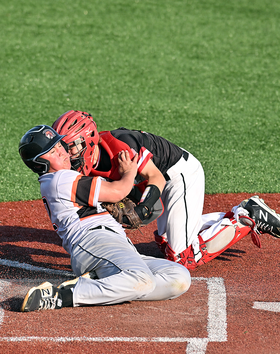Head to head...Arcanum and Newton met Thursday, each with one conference loss, to decide who would emerge as the outright leader in the WOAC. The Trojans' Caden Thompson wasn't successful at scoring in the seventh inning (below), but he more than made up for it on the pitching mound. Read about the game.