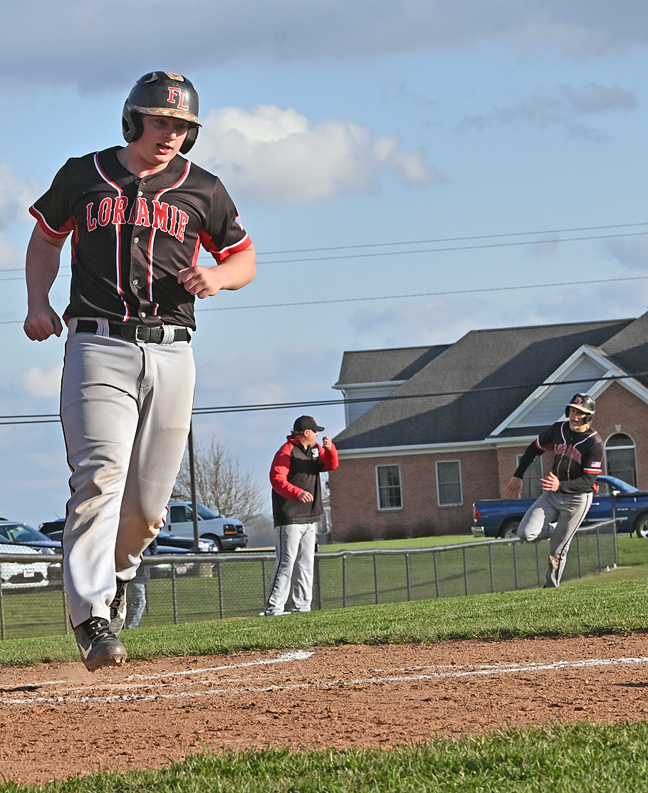 Loramie coach Jeff Sanders (background) waves around a pair of runs in the Redskins' seven-run sixth inning to beat visiting Independence on Tuesday. Read about the game in Wednesday's Press Pros.