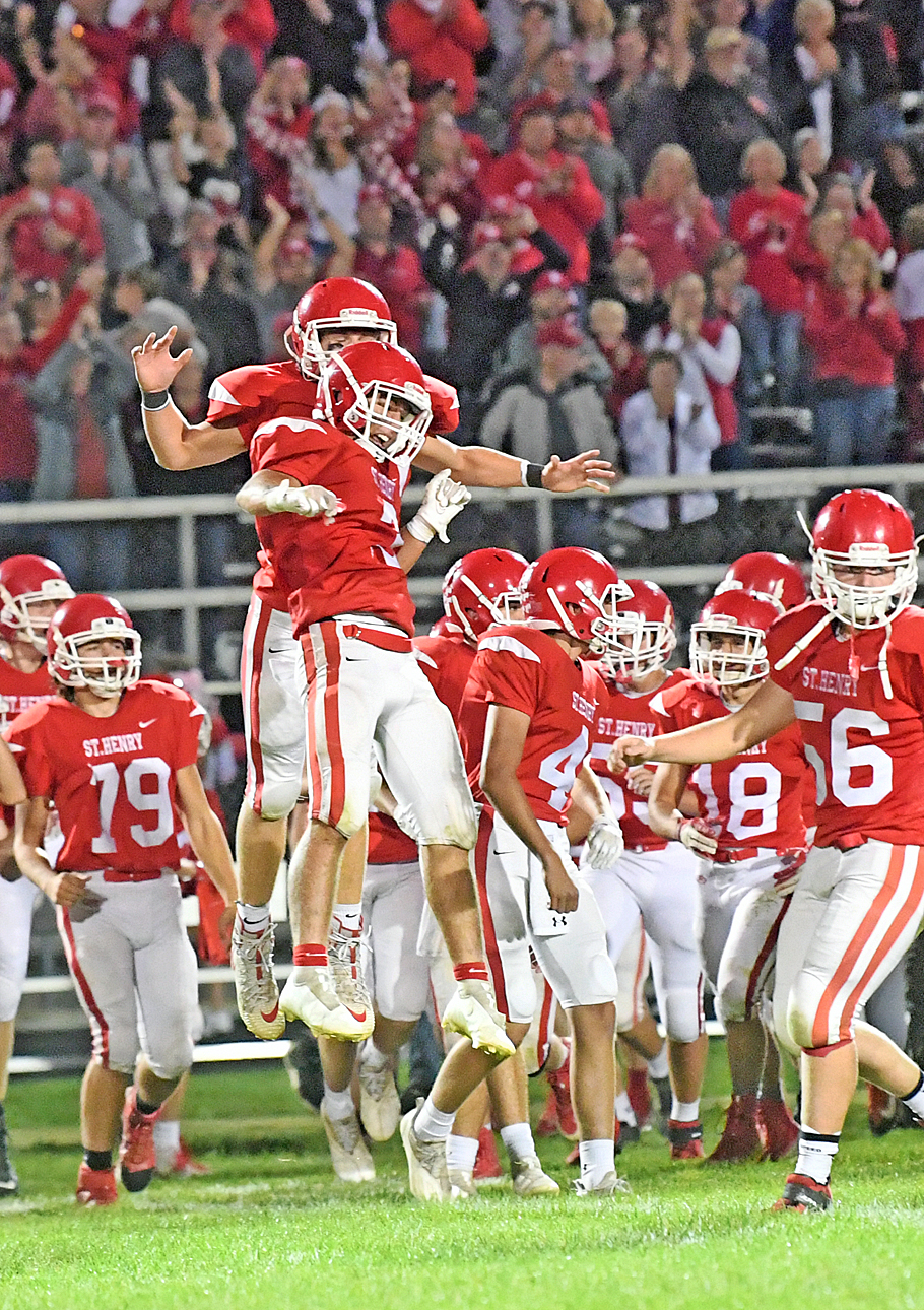 After a thunder and lightning first half, St. Henry's defense put the squeeze on Coldwater in the second half, forced four critical turnovers, and enjoyed Friday's biggest celebration with a 21-14 win over the state's #1 team. Read more in Saturday's Press Pros.