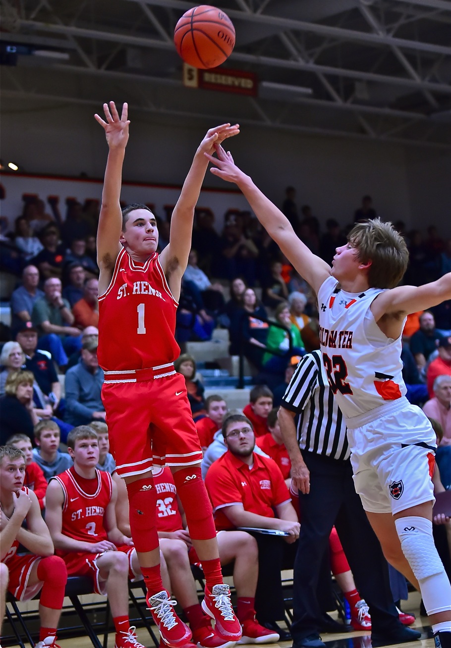 Coldwater got off to a blistering start, but an impressive display of three-point shooting by St. Henry (Seth Heitkamp, below) to finish the first half trumped that start and put the Cavaliers in a hole they could not escape. Read about the Redskins' win in today's Press Pros.