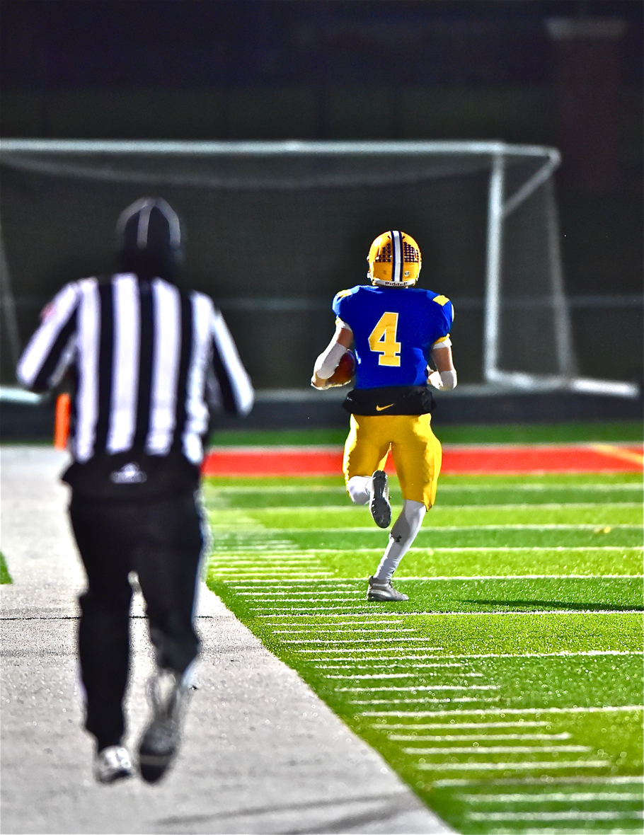Long gone...Marion Local's Peyton Otte is the only player in sight as he broke the biggest play of the night (a 97 yard run from scrimmage) in the Flyers' Saturday Div. VII semi-final win over Patrick Henry. Read more in today's Press Pros inside feature.