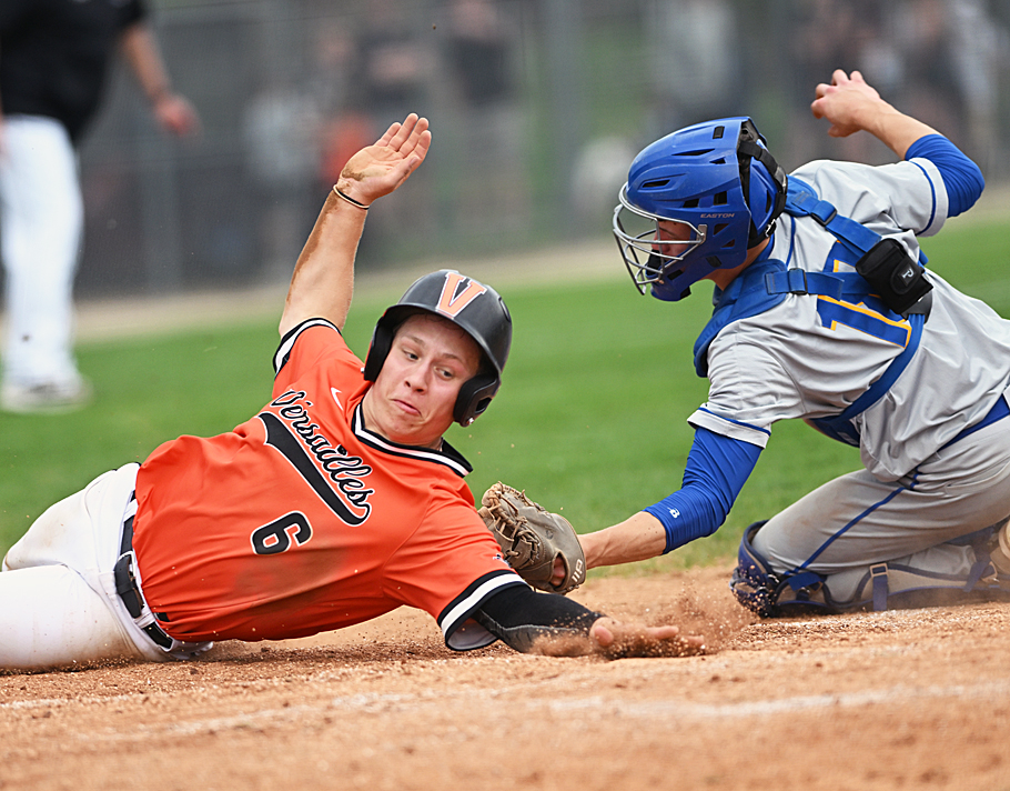 Versailles starting pitcher Ross Francis reaches for the plate and a third inning insurance run in Tuesday's game with Delphos St. John. He was out on the play, but later got credit for a 4-2 win that kept the Tigers in the hunt for the MAC baseball title. Read more....