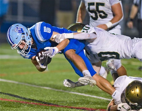 Olentangy Berlin's Bennett Lawrence (8) tackles Dublin Jerome's Luke McLoughlin, who the Bears' defense kept in control just enough to claim a 22-21 victory. (PressPros Feature Photos by John Hulkenberg)