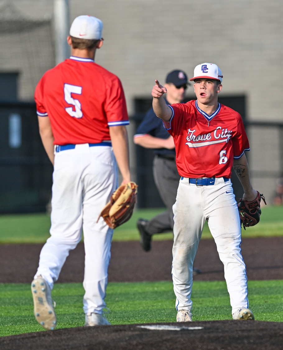 Grove City third baseman Zak Sigman points at ace Keegan Holmstrom, who went all the way in a 4-3, extra-inning win over Bishop Watterson...the Greyhounds' second straight district title and 26th win in 28 career decisions by their Ohio State-bound lefthander. (PressPros Feature Photo by John Hulkenberg).