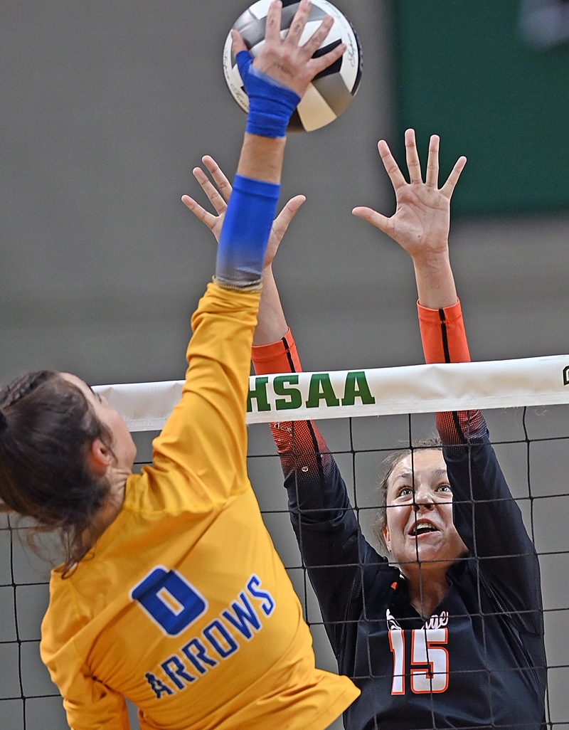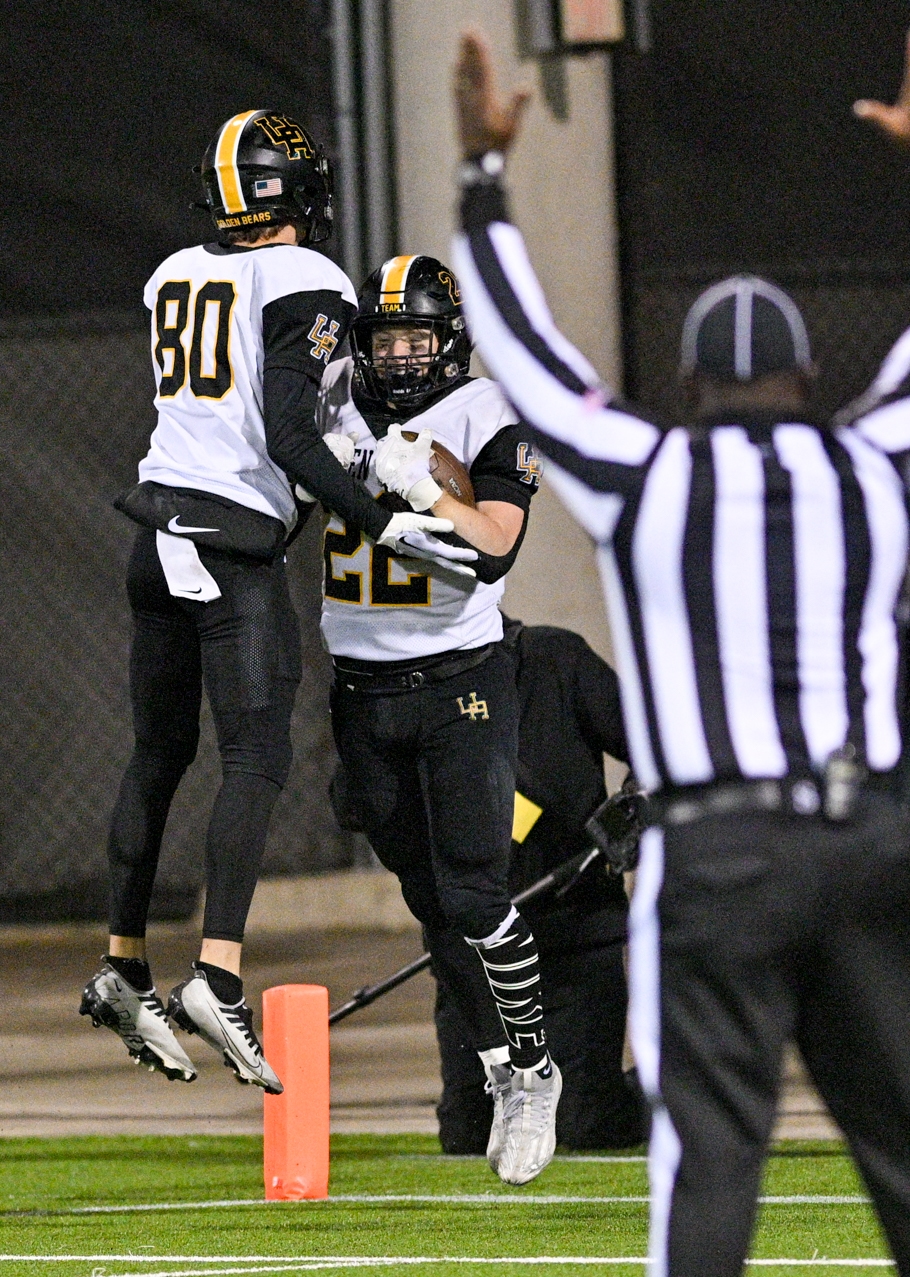 Bishop Watterson's fell into a 14-0 hole early, but its defense -- with Dominic Purcell (6) and Joe Hayes (23) wrapping up Celina's Parker Bertke (9) here -- settled down and gave the Eagles time to pull even by halftime and dominate thereafter in advancing to the Division III state championship game (PressPros Feature Photo by Brian Bayless).