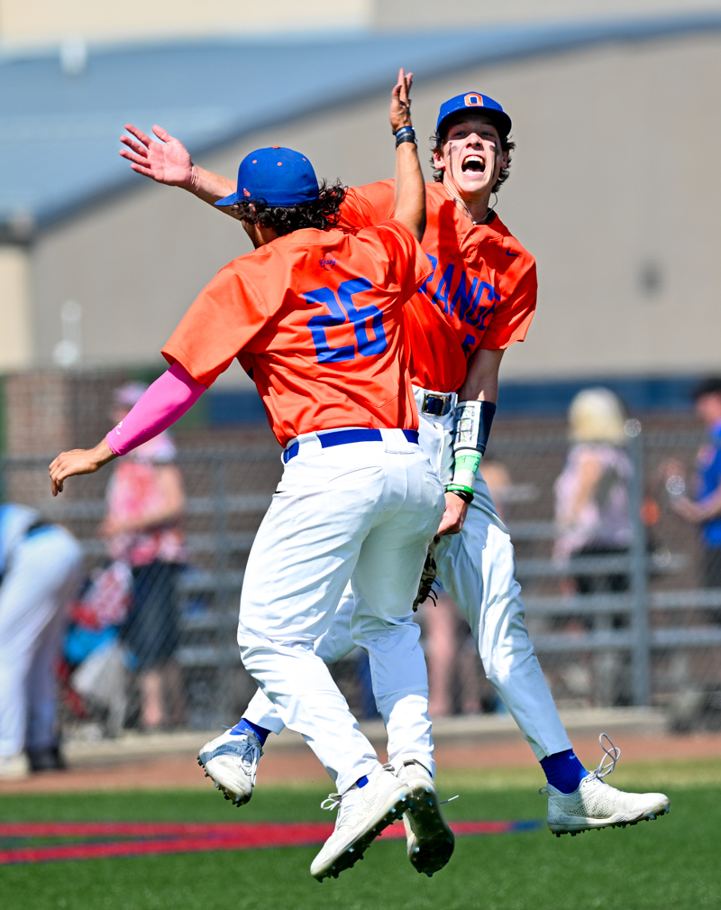 Grove City third baseman Zak Sigman points at ace Keegan Holmstrom, who went all the way in a 4-3, extra-inning win over Bishop Watterson...the Greyhounds' second straight district title and 26th win in 28 career decisions by their Ohio State-bound lefthander. (PressPros Feature Photo by John Hulkenberg).