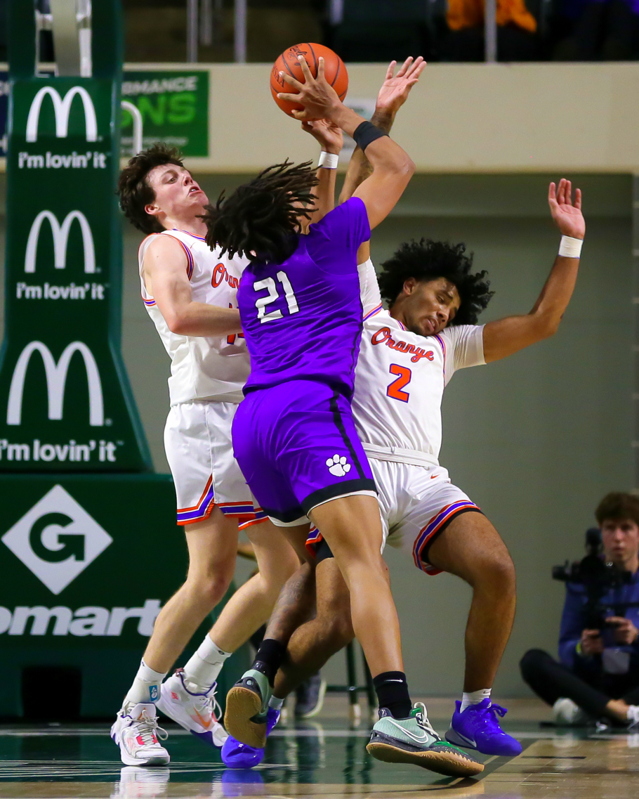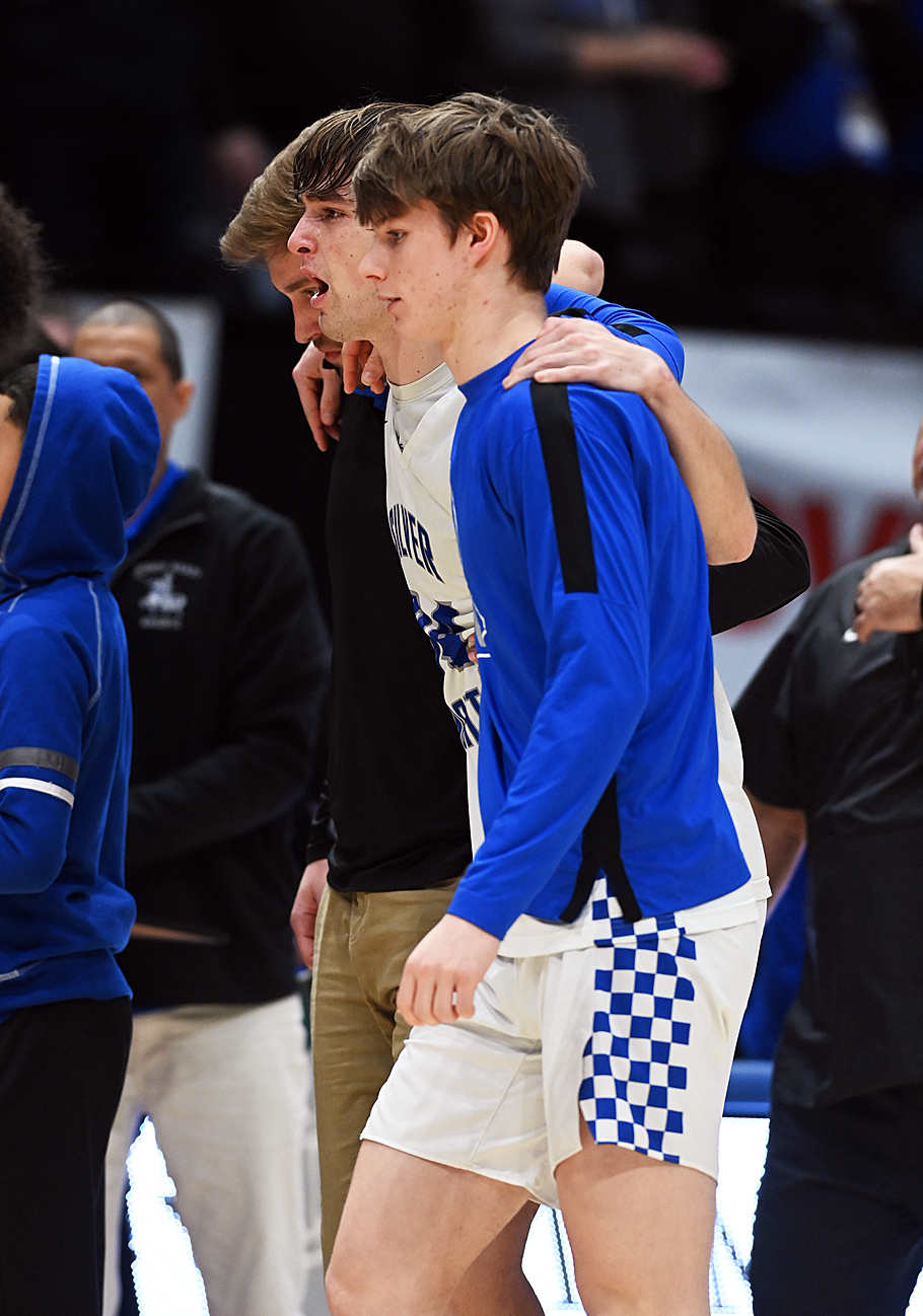 Olentangy Orange defenders Mikey McCollum (14) and Jordan Edwards (2) stand their ground and draw a charge against Pickerington Central's Devin Royal late in the fourth quarter of the Division I regional final, but it was Royal who led the charge for the Tigers in their advance to the state tournament.
