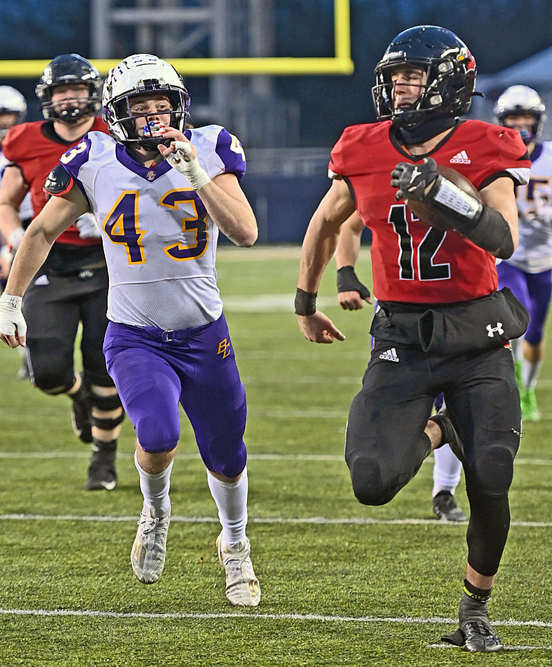 What looks like perfect pass defense from Tippecanoe's Payton Bey (3) on Bloom Carrol's Brodyn Bishop drew a pass-interference call, typifying a night when the Red Devils couldn't make or catch a break in a 35-12 loss in the Division III state semifinals. (PressPros Feature Photos by Brian Bayless).