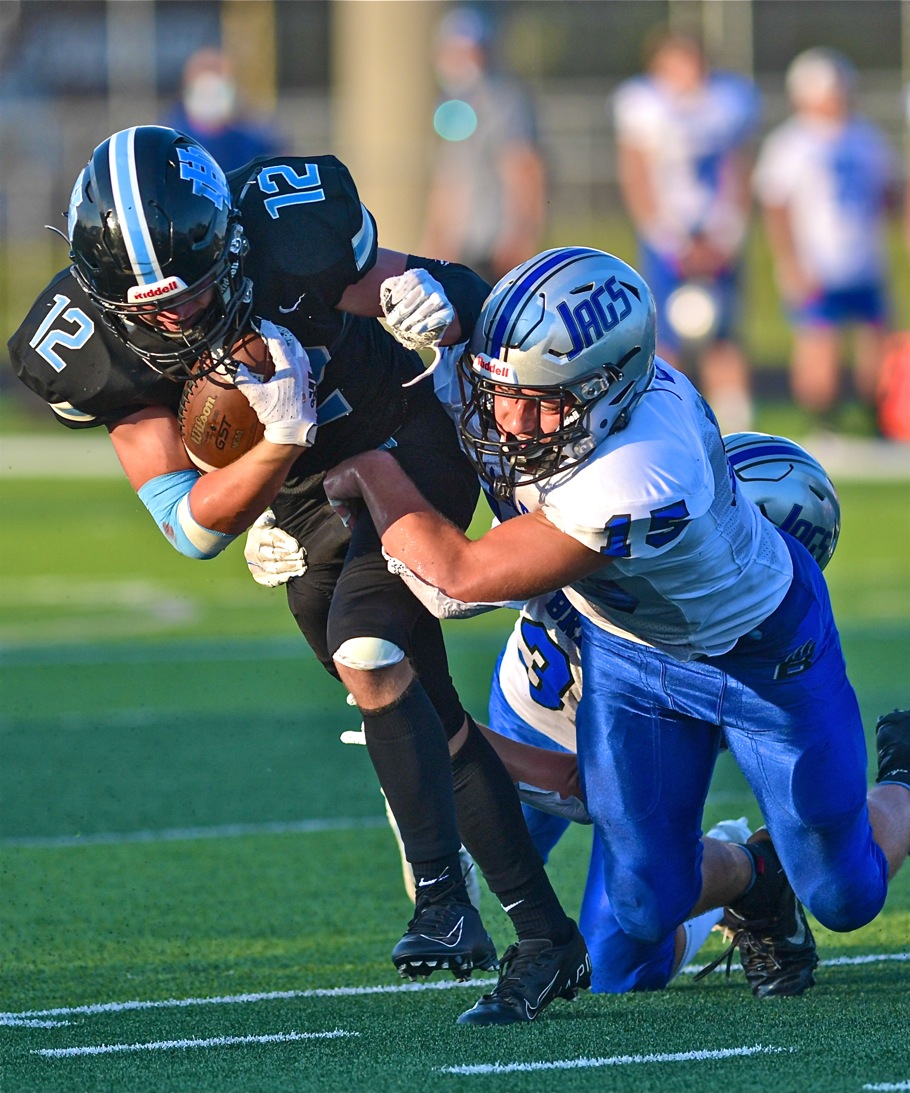 Hilliard Darby did most of its damage through the air in a 21-13 win over cross-town rival Bradley, which benefitted from a sure tackle by linebacker Peyton Murphy (15) on Darby's Nathan Burdick (12) on this play. (Press Pros feature photo by John Hulkenberg)