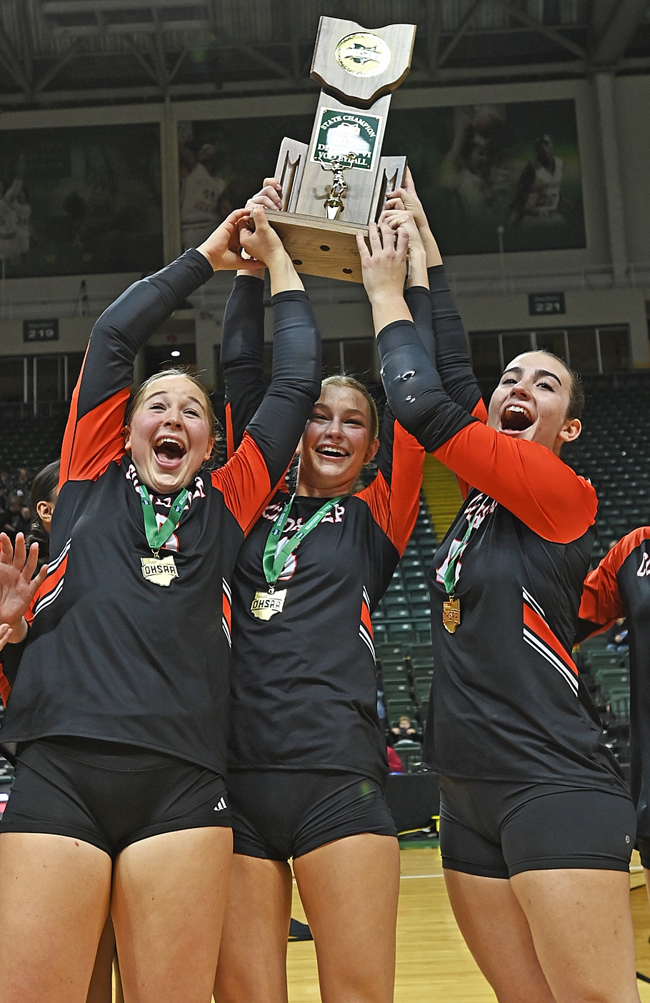 In business-like fashion the Coldwater Cavaliers capped a perfect 29-0 season with the perfect finale...a straight-set win over Marion Pleasant for the OHSAA Division VI title. Seniors Olivia Broering, Morgan Blasingame, and Spencer Etzler (above, l to r), hoist the trophy. Read more in Sunday's Press Pros.