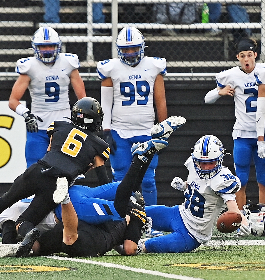 Xenia's Deaunte White scored a school-record seven touchdowns on the way to 47-7 win against Sidney. An injury to Yellow Jacket quarterback Ethan New stalled the Sidney offense, in the second quarter, which paved the road for the Bucs to pull away. Xenia recovers their own onside kick on their first kick-off to Sidney (pictured).