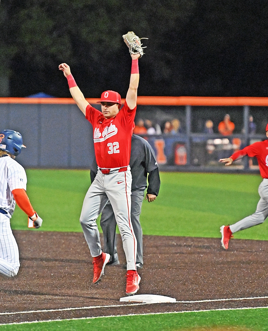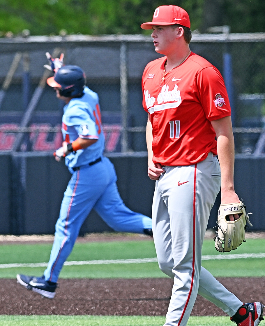 Running on fumes by weekend’s end, the Buckeyes' pitching took a beating at the hands of Illinois’ veteran lineup Sunday (background), and along with it the window closed a bit on their post-season probabilities. Read more in Monday's Press Pros.