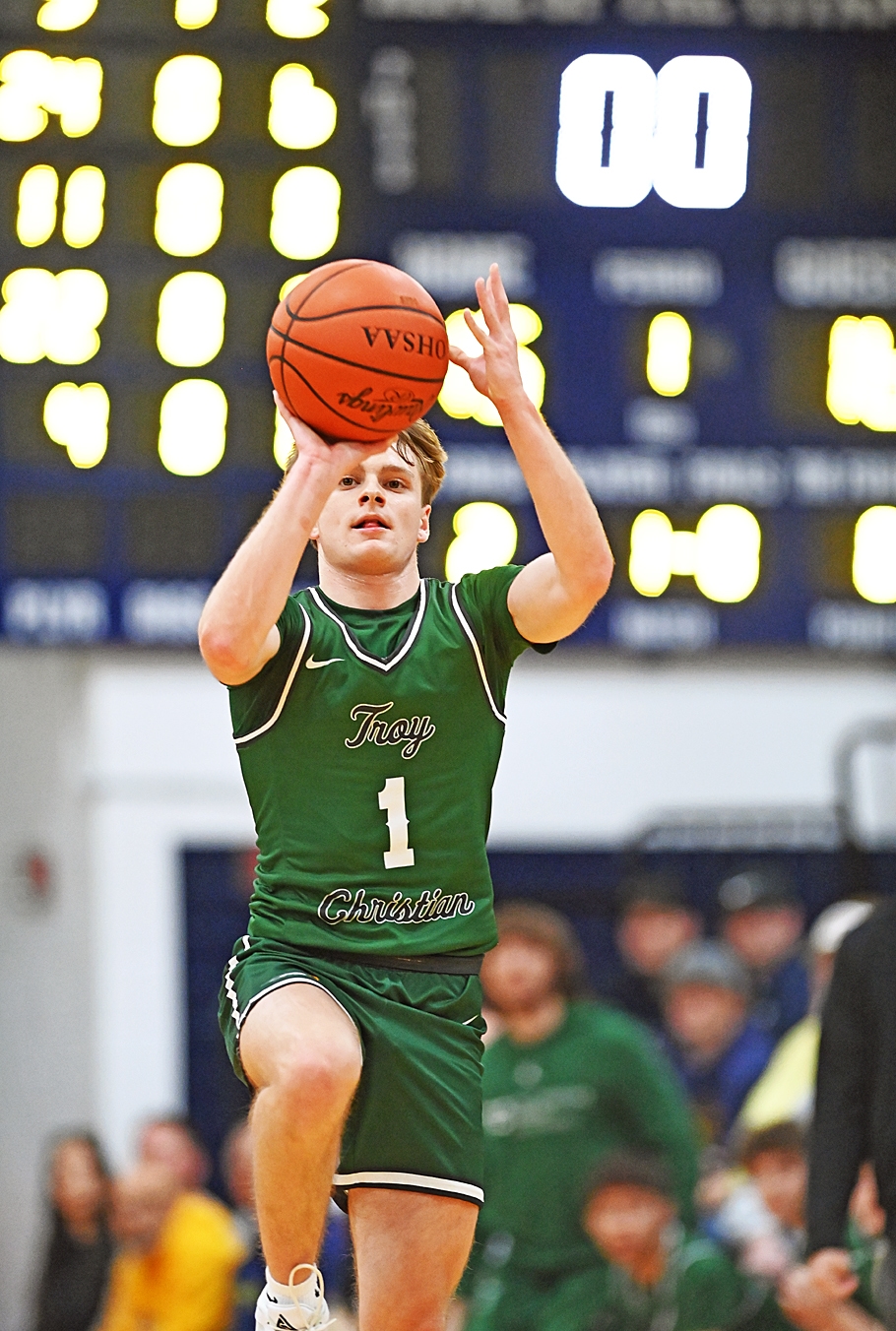 It counted...But Christian Brusman's halfcourt shot to end the first quarter (above) appears to be late with the scoreboard clock in the background. Nonetheless, it was called good and the Eagles rallied for four quarters to knock off the #2-ranked Division II Ottawa-Glandorf Titans Saturday. Read more about the game in Sunday's Press Pros.