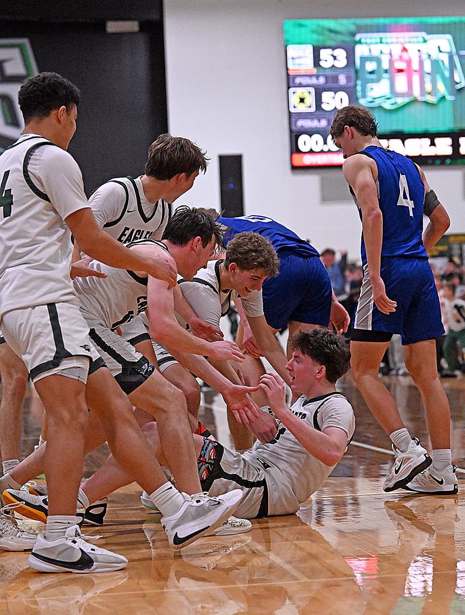 Troy Christian junior Noah Fecher gets mobbed (above) by teammates after finishing off his biggest night of the season Tuesday with a buzzer-beating three-point shot to beat Miami East in overtime, 53-50. Read about the game in Wednesday's Press Pros.