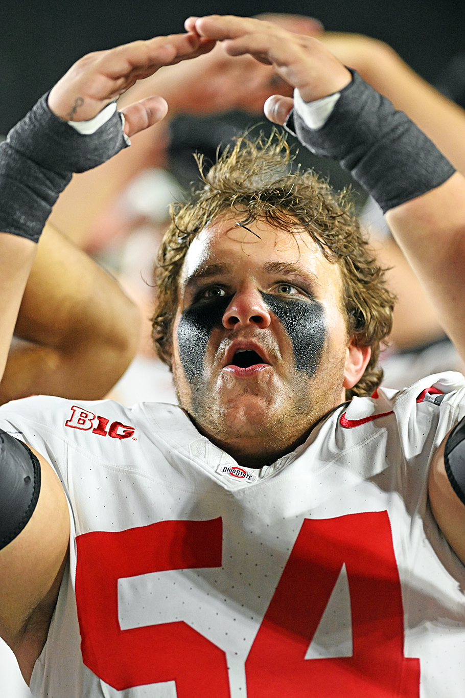 Backup lineman Toby Wilson celebrates with an O-H...after Chip Trayanum and Ohio State found a way to score from the 1-yard line, silence critics, and give head coach Ryan Day the freedom to speak his mind on a memorable night at Notre Dame Stadium. Read Jeff Gilbert in Sunday's Press Pros.