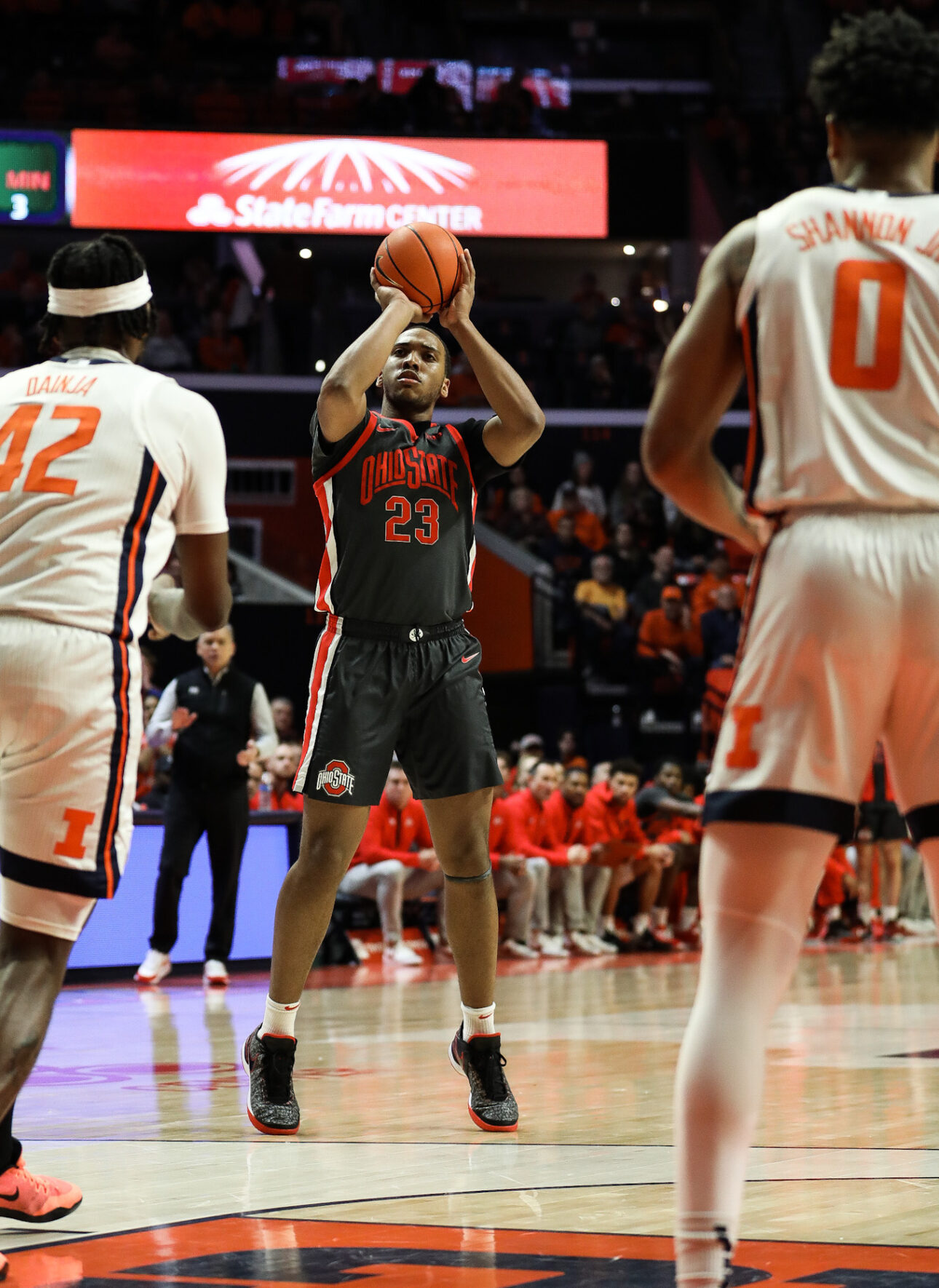 Zed Key missed this three-point try, and most everything else he tried in a rough performance that contributed to Ohio State's 69-60 loss at Illinois that extends the Buckeyes' miserable January. (Photo courtesy of OSU).