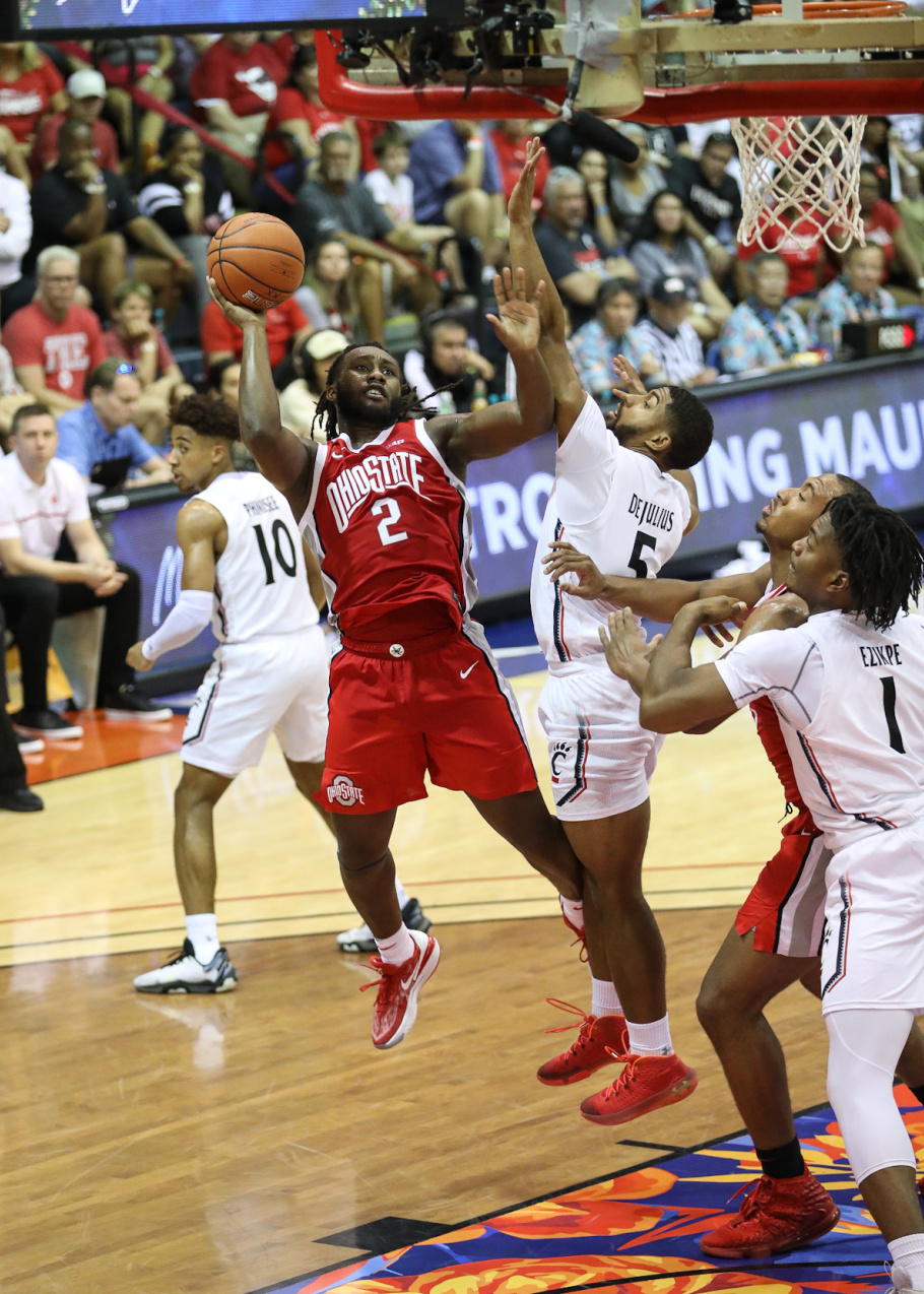 The University of Dayton Flyers and Wisconsin Badgers put on a clinic on how not to shoot straight in the first round of the Bad Boy Mower Battle 4 Atlantis tournament Wednesday in The Bahamas and they produced an old-school score with Dayton losing, 43-42 when it couldn't get off a last-ditch shot. Hal McCoy UD Flyer's Basketball.