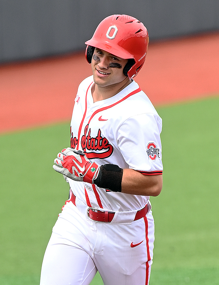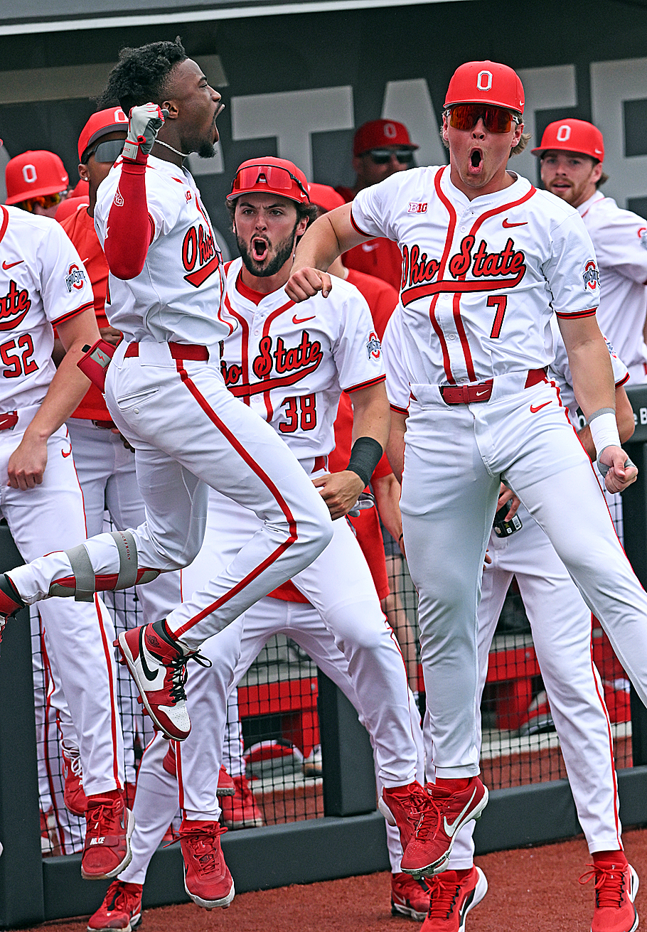 Lee Simpson (above, left) celebrates his home run in the sixth inning Saturday as the Buckeyes won for the sixth time in a row, their second consecutive Big Ten Series, and won the home run derby in a game that saw Maryland and Ohio hit eleven home runs between them. Read more about the game and the Buckeyes.