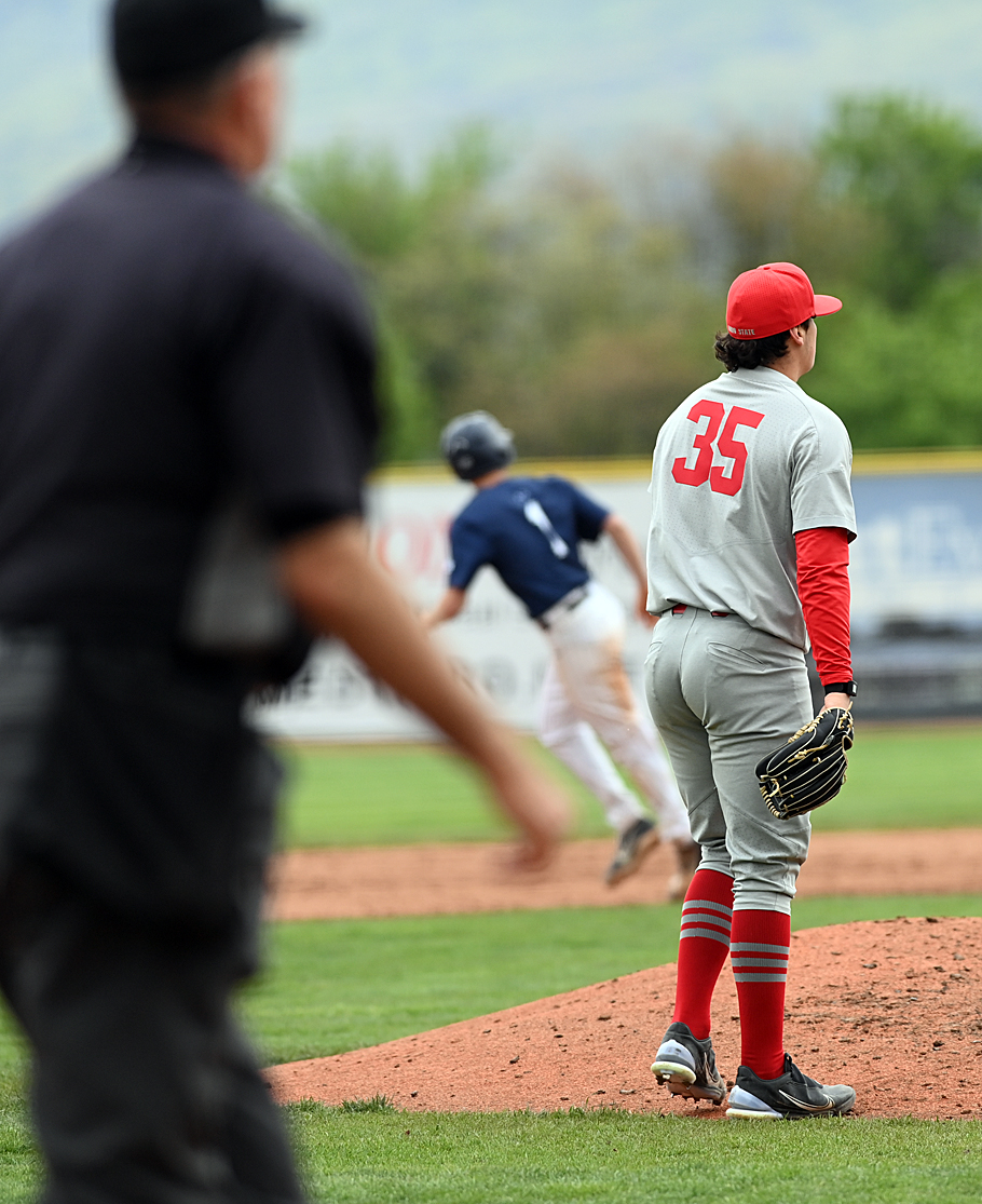 Fort Loramie righthander Maverick Grudich spun a gem from the mound Tuesday, and the Redskins collected enough hits in one big inning to seize control of the Shelby County League baseball standings over Russia...at least for now.