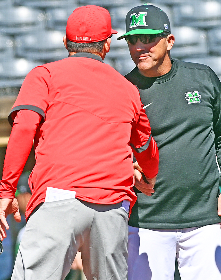 Old Greets New...Coaches Bill Mosiello and Greg Beals exchange greetings prior to meeting on the field Wednesday in Charleston. The Buckeyes extended their win streak to five games with a 5-1 decision over Marshall.