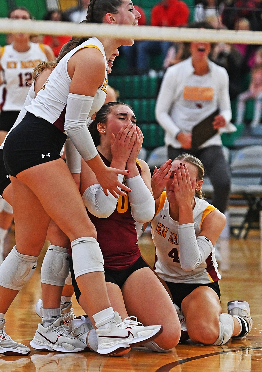 Keira Steininger (above, center) celebrates with her teammates as New Bremen knocks out Fort Loramie in Saturday's clash of Division IV's #1 versus #2. New Bremen advance to next week's Final Four seeking their four title in six years. Read about the match in weekend Press Pros.