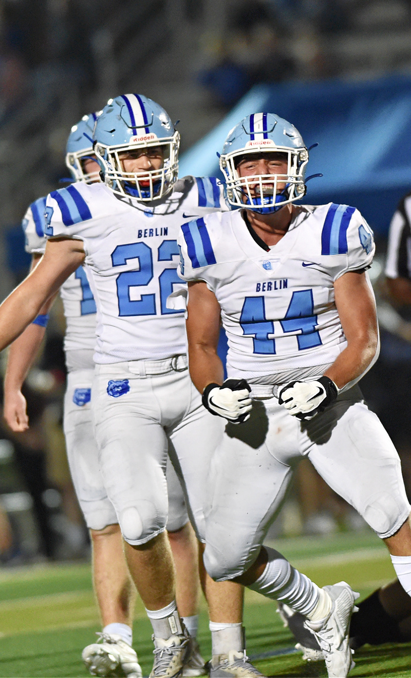 Olentangy Berlin linebackers Parker Daniels (44) and Zach Caudill (22) celebrate a late-game stop that gave the Bears one final chance to seek a tying touchdown, but it was Hilliard Bradley that wound up celebrating a 20-13 victory when time ran out. (PressProsMagazine.com feature photo by Sheri Hooley).