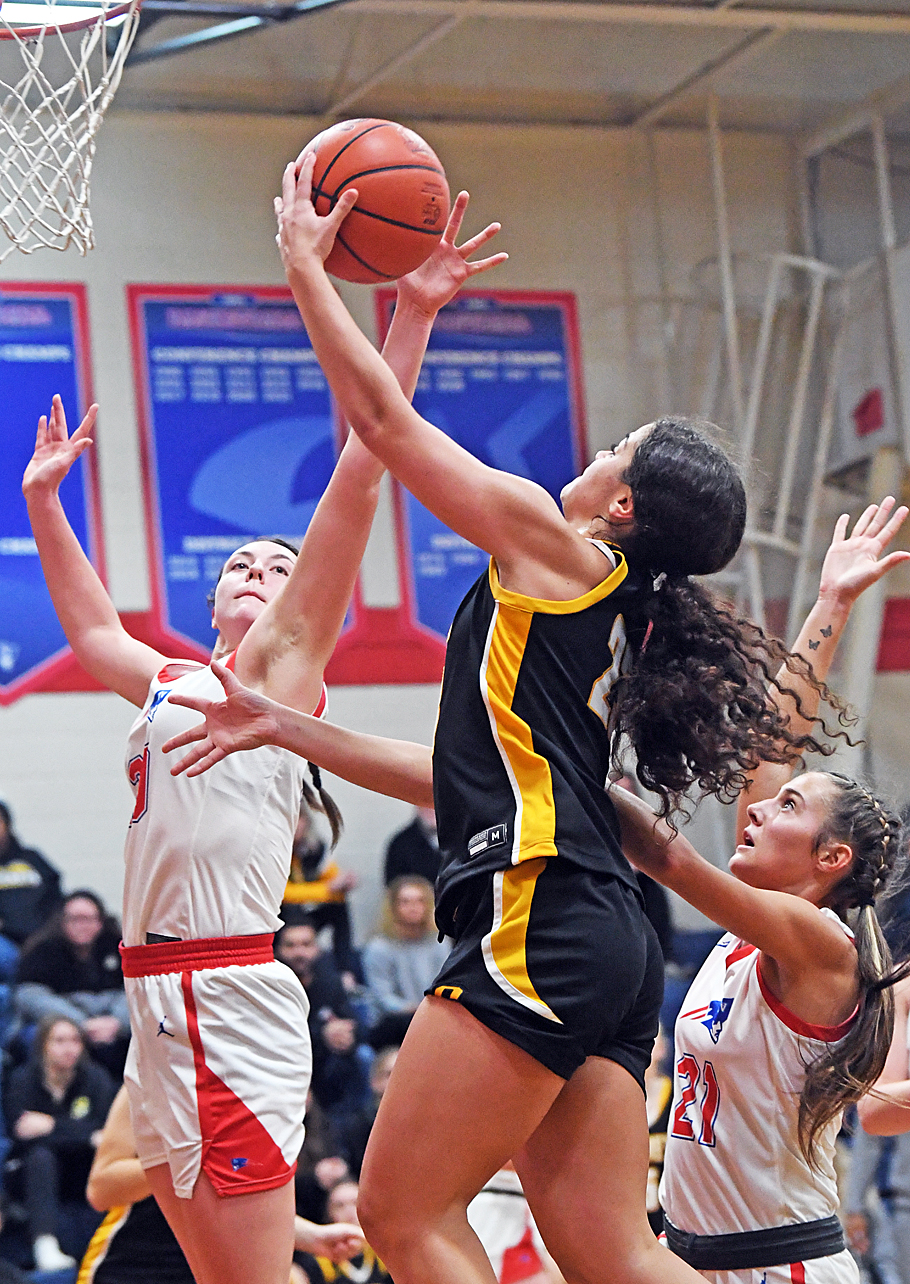 Tough place to score, win...Tri-Village won its fifth game of the season Monday, 59-31, with dominating post defense (below), three-point shooting, and the occasion of Morgan Hunt's 1,000th career point. Read more about the game in the latest Press Pros feature.