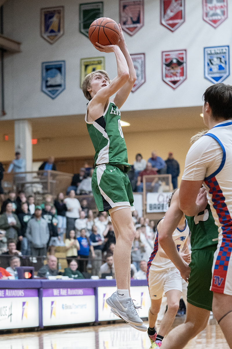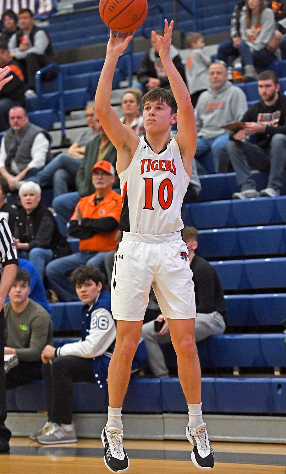 Coldwater's Mason Welsch adds the finishing touch to Coldwater's surprising 49-40 win over #1-ranked Spencerville in Tuesday's Division VI district semi-final game in Wapakoneta.  Teammate Owen Kunk (foreground) gives the sign of approval.  Read about the game in Wednesday's Press Pros. (Press Pros Photos by Julie McMaken Wright and Sonny Fulks)