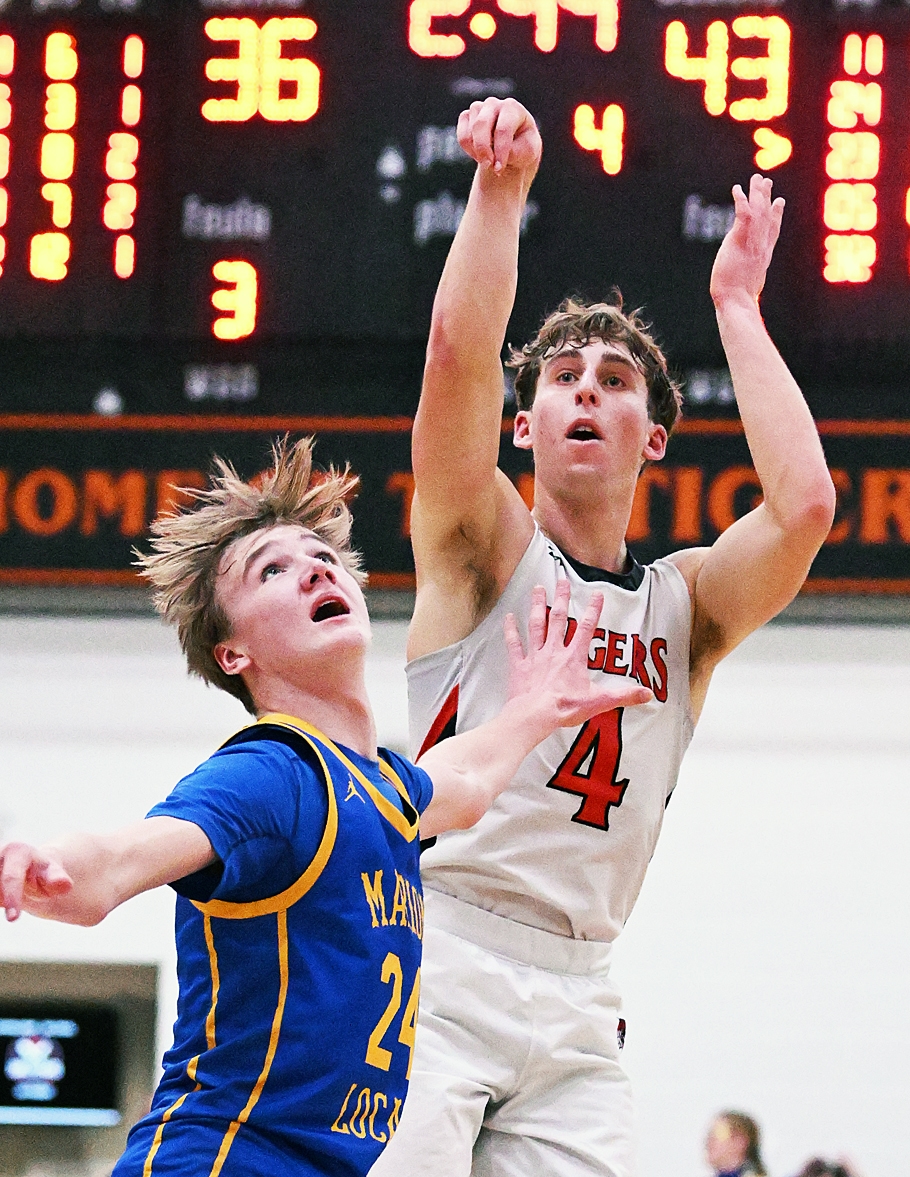 Jackson Center's Lucas Heitkamp and Marion Local's Kale Ahrens watch Heitkamp's fourth quarter three-point shot cut a 16-point Marion lead to just 4 points with three minutes to go. That was as close as the Tigers would get, falling Saturday to the Flyer, 52-47. Read more in Sunday Press Pros.