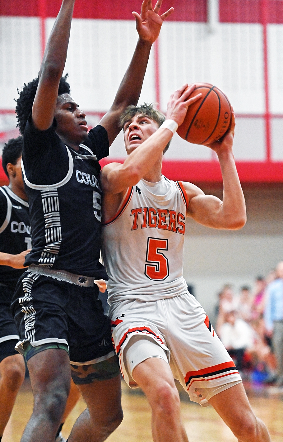 Coldwater's Mason Welsch adds the finishing touch to Coldwater's surprising 49-40 win over #1-ranked Spencerville in Tuesday's Division VI district semi-final game in Wapakoneta. Teammate Owen Kunk (foreground) gives the sign of approval. Read about the game in Wednesday's Press Pros. (Press Pros Photos by Julie McMaken Wright and Sonny Fulks)