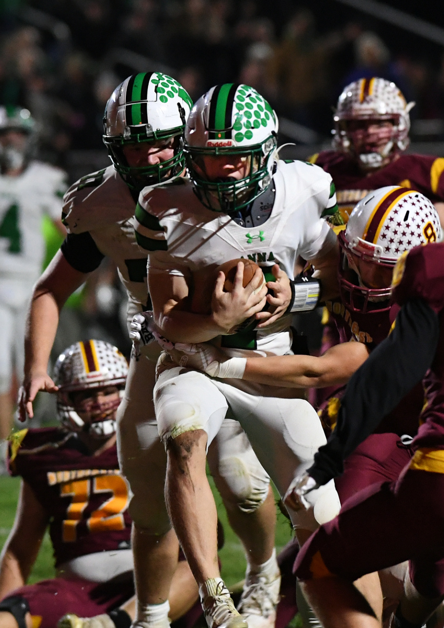Anna sophomore Logan Ziegenbusch drags defenders into the end zone on the first of his three rushing touchdowns, powering the Rockets to a 28-8 win over Northeastern and into the Division VI regional finals against defending state champion and MAC rival, Coldwater. (PressPros Feature Photo by Sheri Hooley).