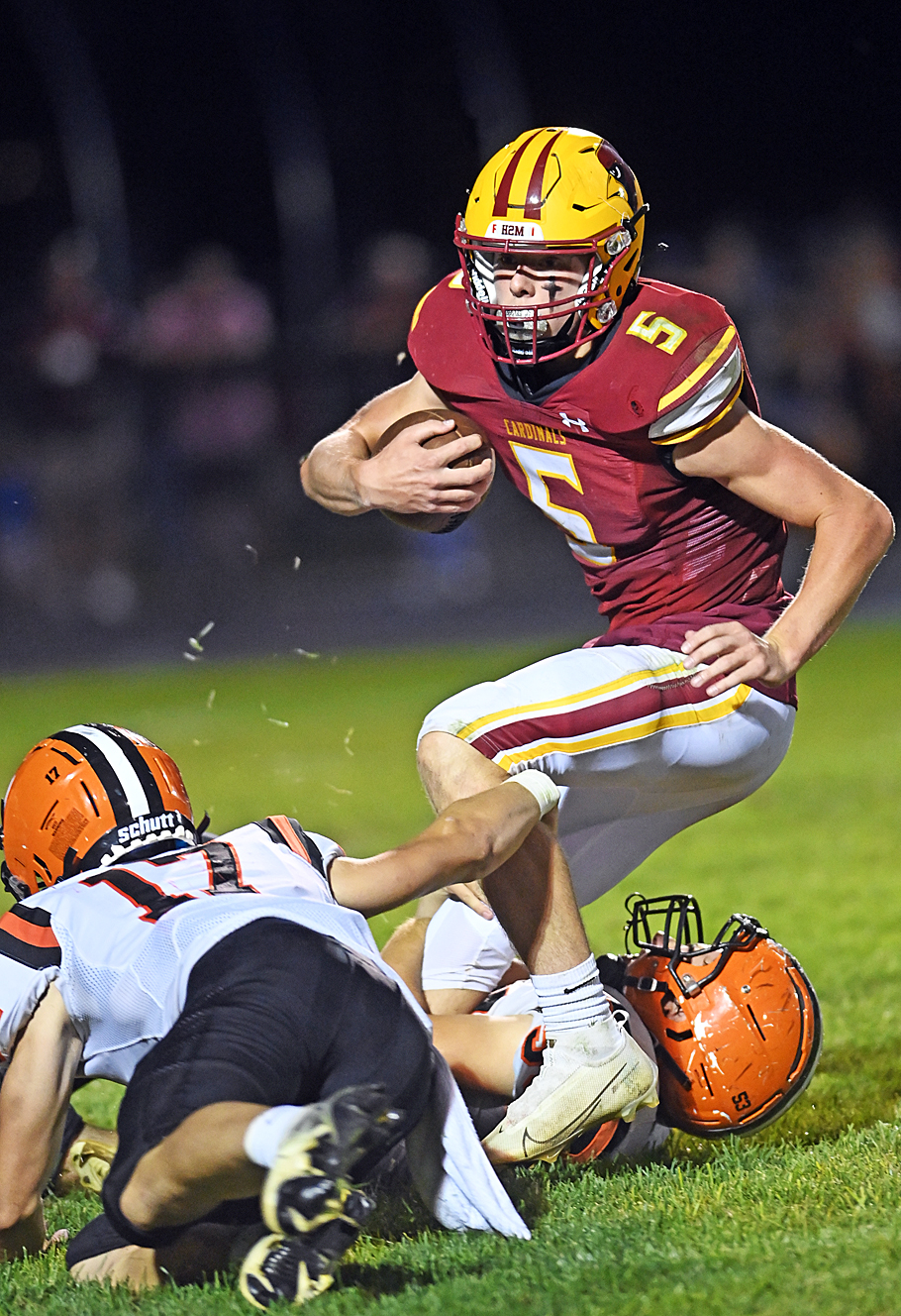 Quarterback David Homan (above) accounted for half of New Bremen's total yards, and the Cardinals defense pitched an impressive second half shutout to hand Versailles its first loss of the season. Read about the game in Saturday's Press Pros.