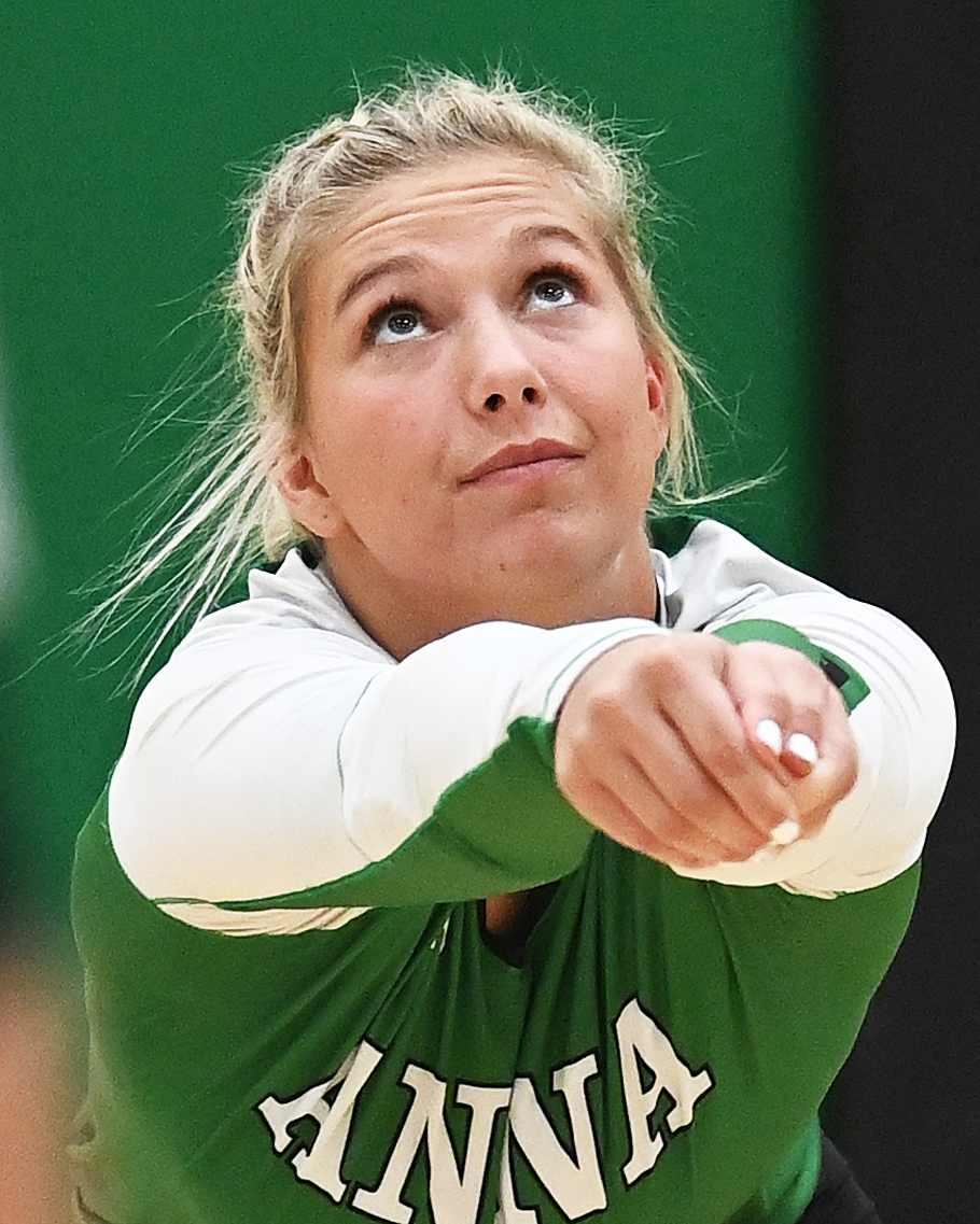 The Look!...Anna's Morgan Shepherd watches a wayward shot in Tuesday's opening set loss to Marion Local. It got better, however, as the young Rockets pressed the Flyers before falling in straight sets. Read more in Wednesday's Press Pros.