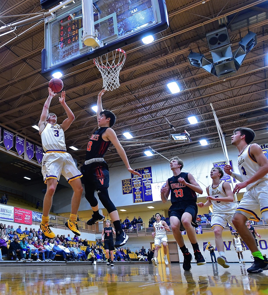 High-flyin'....Butler's Michael Kreill scores two of his 13 points during the Aviators 17-4 second half run Tuesday against Versailles. They're impressive, ranked #9 in the state, and headed for a late-season GWOC North showdown next week with Sidney. Read more about them in today's Press Pros inside feature.
