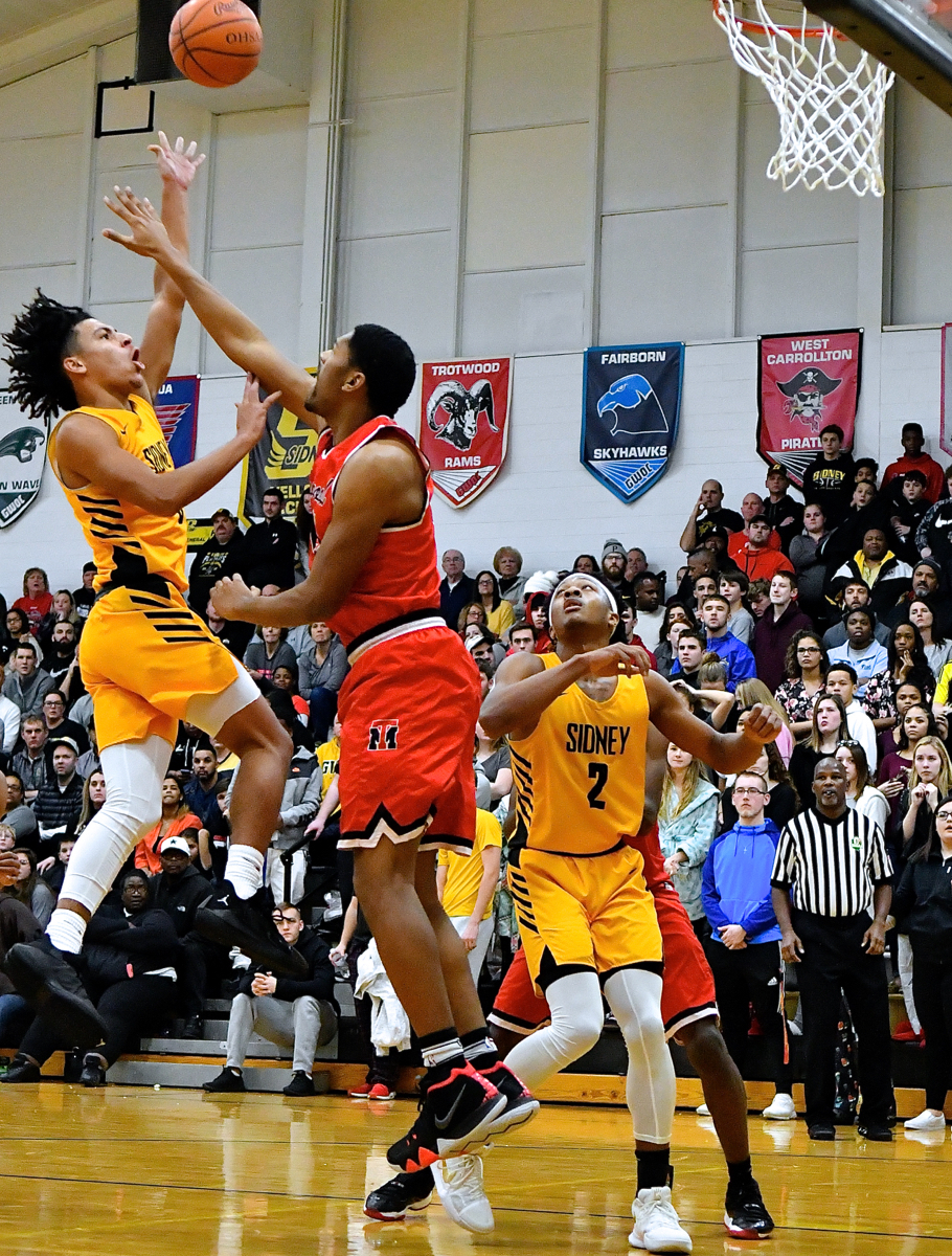 Sidney gave Trotwood all it could handle for just over 27 minutes, but the Rams' put the game away with a game-ending 26-7 run. Sidney's Darren Taborn (photo) lofts a jumper over Trotwood's Justin Stephens for two of his season-high 23 points.